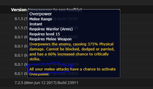 | Description | https://ru.wowhead.com/spell=7384 последним изменении легиона 7.2.5 (Mon Jun 12 2017) Build 23911 было изменение условие прока с "только абилок" на "ВСЕ атаки" т.е даже белые и с таланта "Дополнительный выпад"(последнее не точно, но логично, как сейчас не тестил ) у нас сейчас прокает только от абилок. и хотел бы узнать какой сейчас стоит шанс прока? | ||||