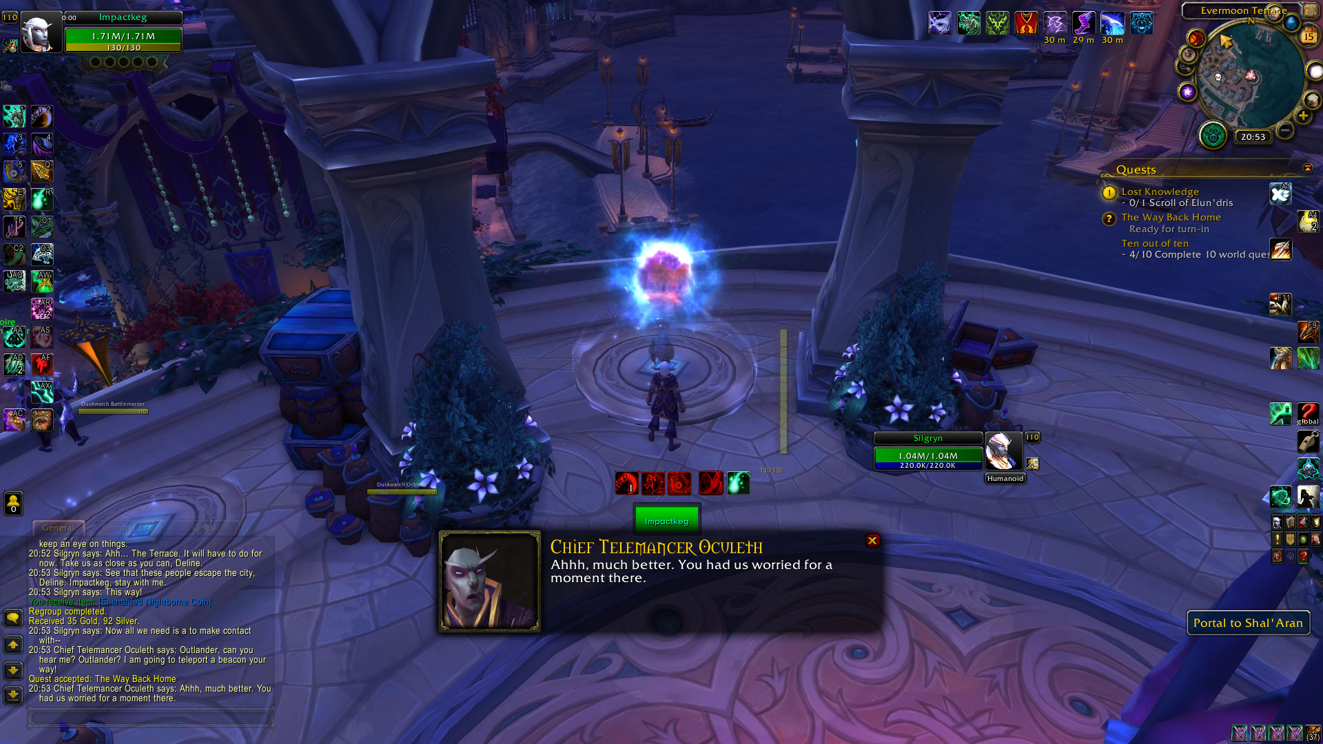 | Additional Information | 141325 (Entry: 265529) - [Portal Shal'Aran X:530.446 Y:3772.02 Z:34.4084 MapId:1220] Found near gameobjects (distance 10): 1 | ||||
