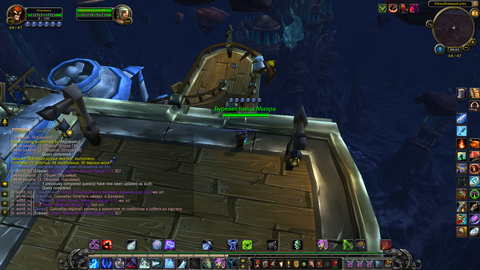 | Description | квестгивер Буревестница Милра (42684) которая стоит на корабле летающем по маршруту в Подземье немного завтыкамши а именно -Не принимает и не выдает доступные квесты. при помощи ГМа я сначало взял а потом и сдал парочку(остановился на -Все наши друзья мертвы (26248) -этот у меня сдан(через ГМа) а теперь Милра просто стоит невозможно у нее брать квесты а также их сдавать-Дальше будут-Каюта адмирала(26249)-Ни команды ни капитана(26427) -Пленных не брать(26251) -А впрочем взять одного пленного(26250-Растянуть связки (26254) -Вернуться в Храм Земли(26255).Есть есще квестодатель на корабле но скорее всего его постигла та же участь что и Милру.Проблема скореев ПОЗИЦИОНИРОВАНИИ НПС относительно корабля поскольку в определенной точке можно убить агрессивный мобов находящихся там же-а потом пишет-вне зоны видимости. | ||||