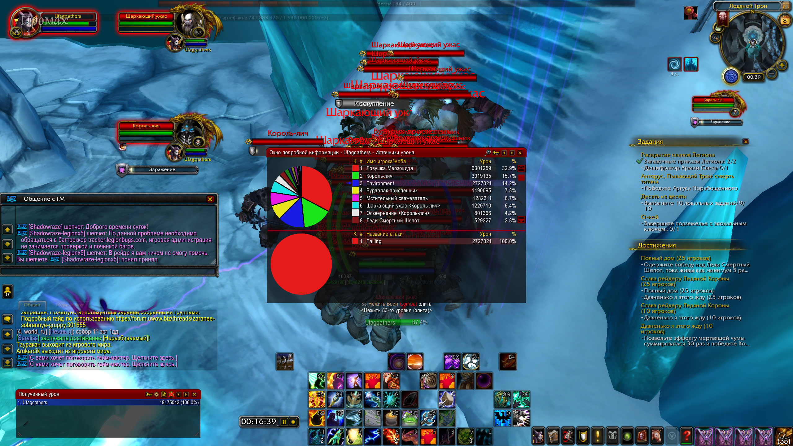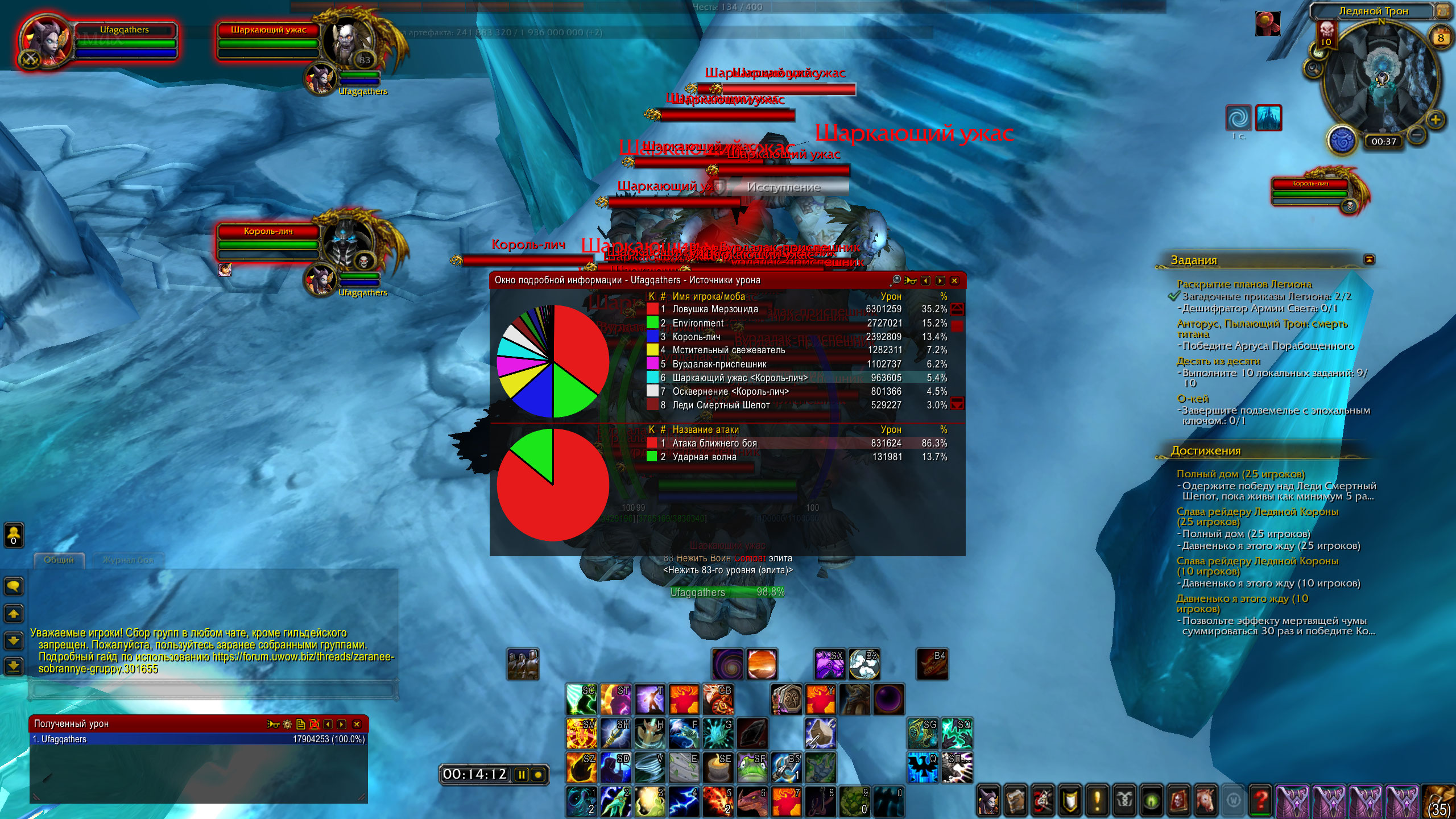 | Steps To Reproduce | начинаеться бой с личем ждем когда он призавет мобов, ждем шаркающего ужаса, ждем накопления стаков чумы и передачу лечу так до 30стаков, после убиваем лича и получаем достижение ... | ||||
