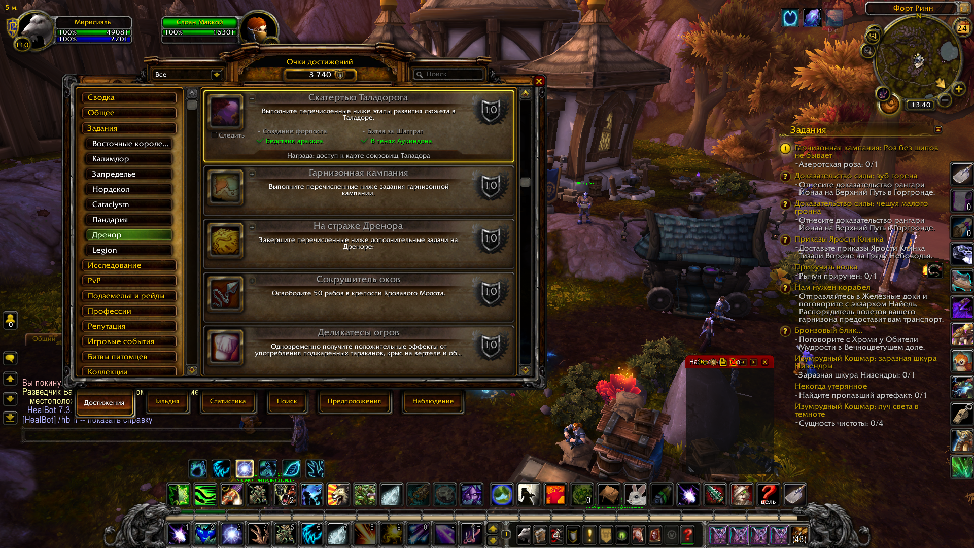 Доброго времени суток! "Создание форпоста" выдаётся за любой из квестов (https://www.wowhead.com/ru/quest=34981) (https://www.wowhead.com/ru/quest=34711). Цепочки на каждый квест Вы можете найти, кликнув на ссылки. Начало цепочки идёт с (https://www.wowhead.com/ru/quest=34558), который выдаётся после любого из квестов (https://www.wowhead.com/ru/quest=49565) (https://www.wowhead.com/ru/quest=34676) (https://www.wowhead.com/ru/quest=37183) "Битва за Шаттрат" выдаётся за квест (https://www.wowhead.com/ru/quest=34099), цепочка которого начинается с (https://www.wowhead.com/ru/quest=36801) Так как у нас нет разработчика на квестах Дренора, то и работает весь континент соответствующе. Любой из квестов Вы можете проверить командой ".quest status ID", где вместо ID вписываете номер квеста из ссылки. |
