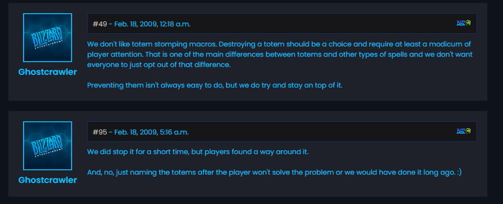 | Description | https://tracker.legionbugs.com/view.php?id=28374 Отличная реализация тотема контрудара на КРОСС бг, ставить 2 шт. Один союзный, второй враждебный. Зеленый и красный. В одну точку. Проблема в том что 2 тотема контрудара стоят в ОДНОЙ точке! Приходится 20 раз тыкать пока попадешь в нужный. Прошу разделить 2 тотема в пространстве. ------------------------------------------------------------ выбираю тотем контрудара через макрос: /ц Тотем Контрудара И выбирается союзный зеленый тотем который бить нельзя и модельки которого нету. А вражеский выбирается через клик по тотему. Персонаж за альянс в команде альянса. Шаман (кажется персонаж альянса) за орду. | ||||