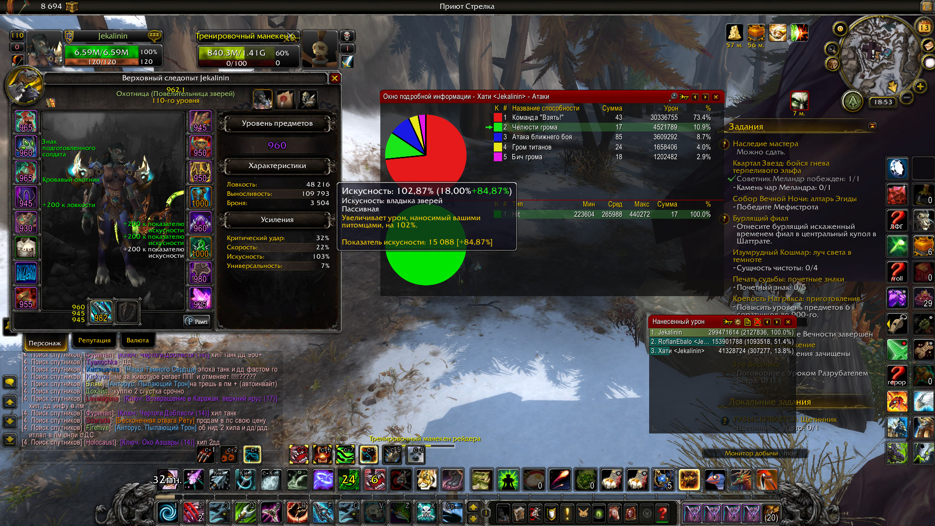 Взял в пример https://ru.warcraftlogs.com/reports/DQ1T8N36kPBpX9th#fight=36&type=damage-done&source=119 и подогнал статы равные ему за исключением искуси которой на 3к больше у меня (20%). Разница Имеется в том что у меня отсуствуют 4т20 (15% урона команды взять под звериным неистовом) по всем остальным статам и бонусам приблизительное равенство. А так же провел замер "стаи воронов" и вышло так что урон приблизительно равен моему, но искусности на 20% больше у меня, следовательно имеется какой то косяк в искусности у бма. |