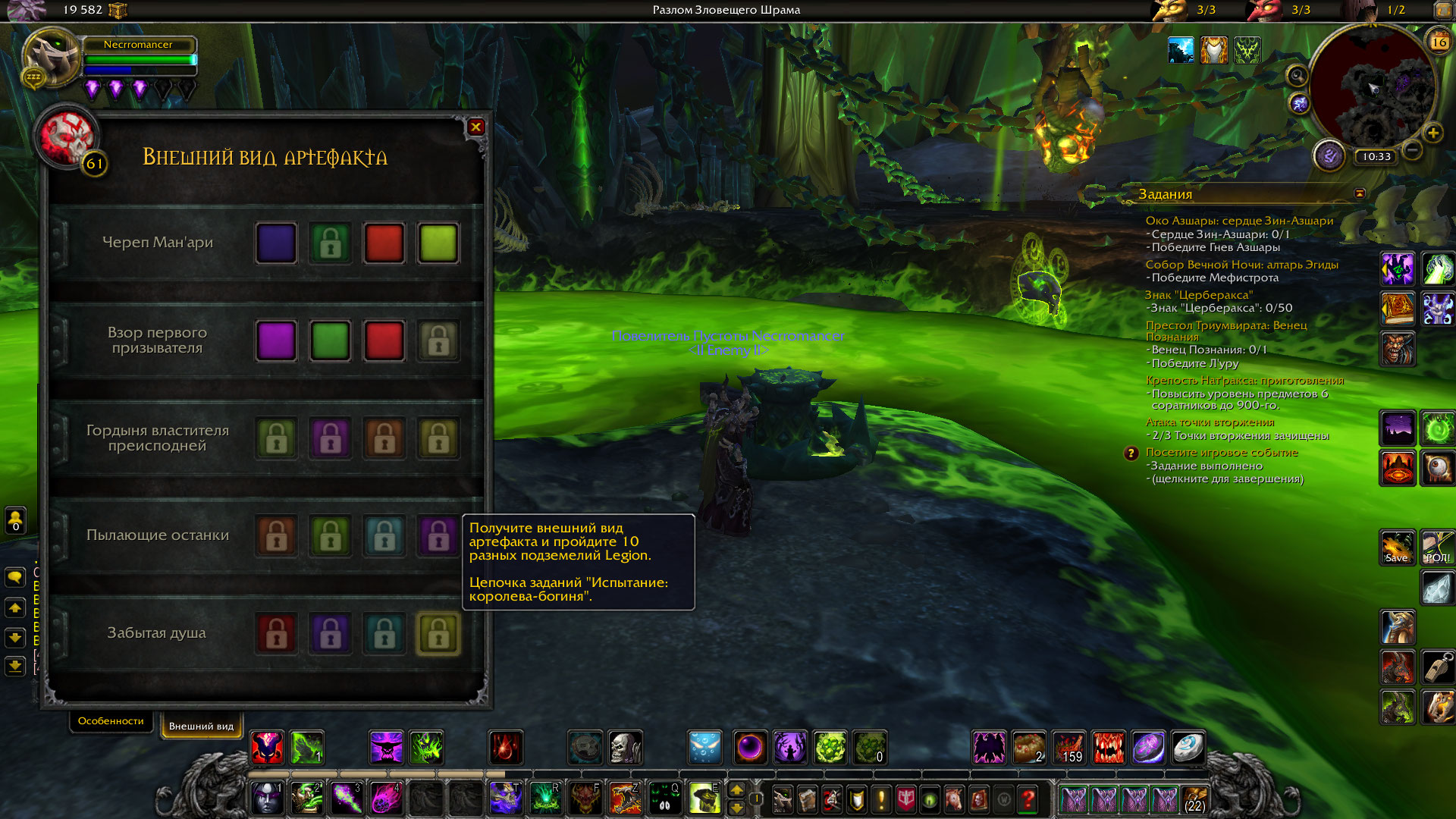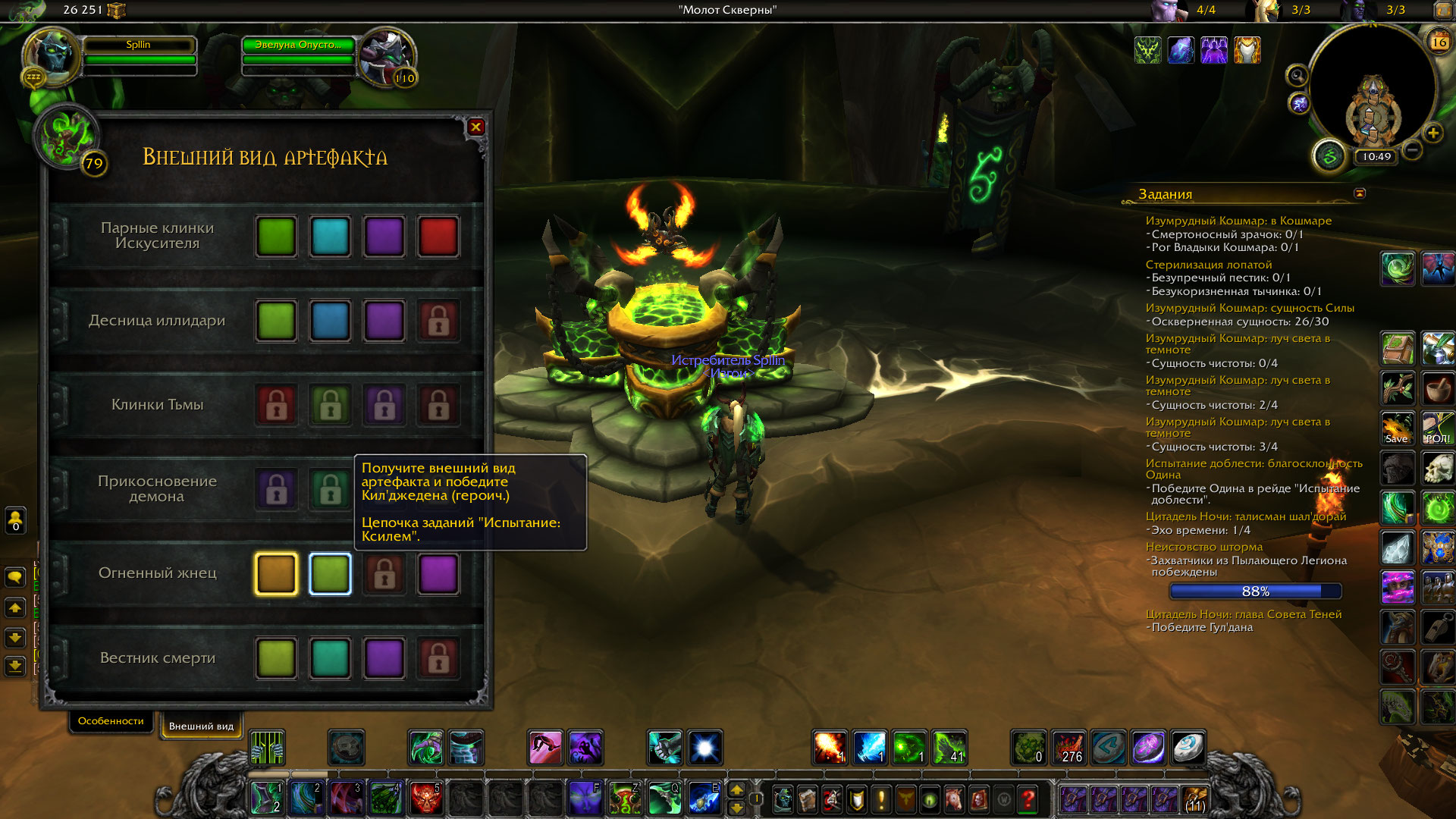 | Description | Пропал облик артефакта за достижение (Убить Кил Джедена и пройти 10 подземелий легиона), и так на всех персонажах, но частично, на самом первом персонаже (ДХ) в ветке "Истребитель" скин "огненный жнец" остался, в ветке "Месть" пропал скин "крылья мрака" *Просьба вернуть все! | ||||
