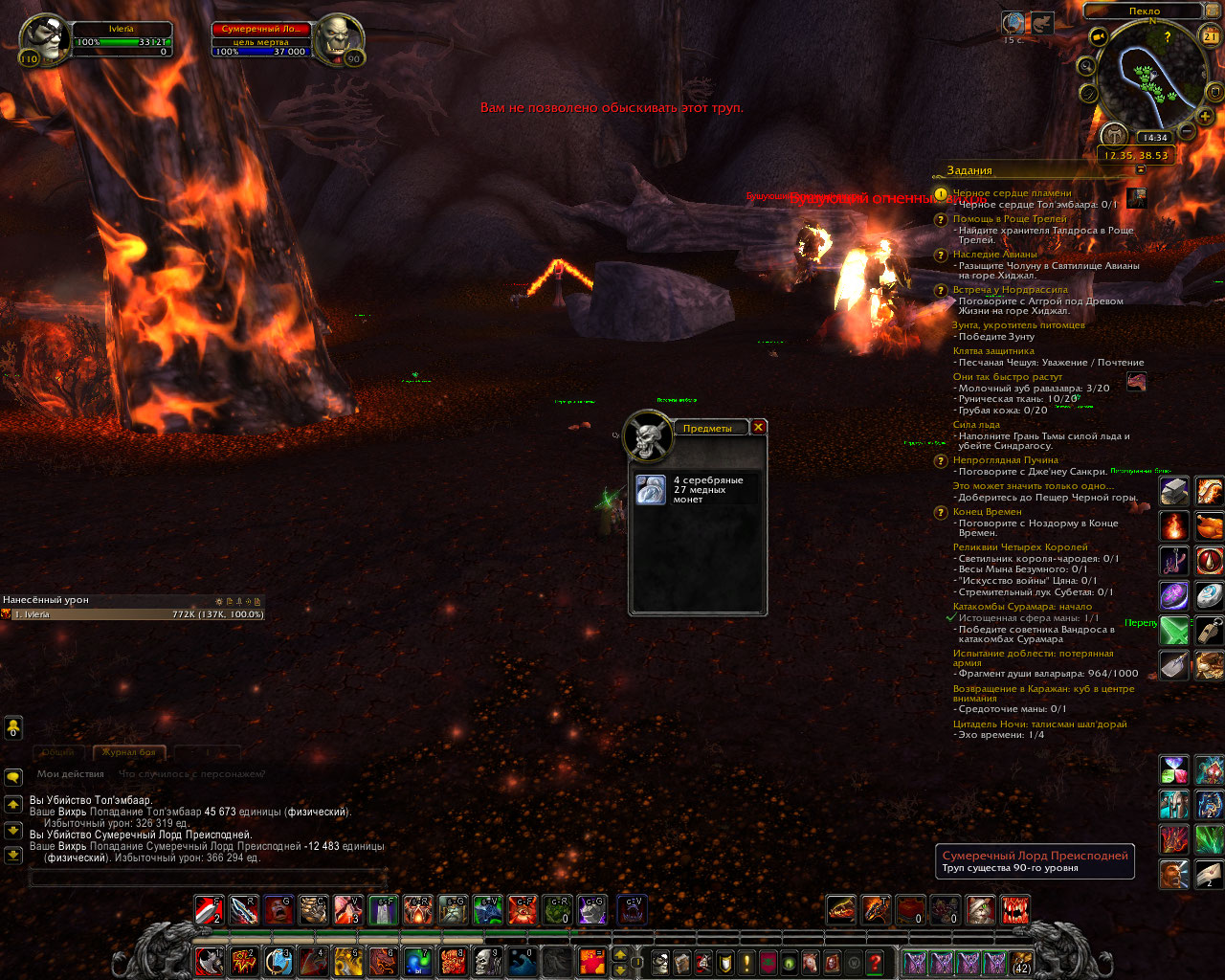 | Description | https://www.wowhead.com/ru/quest=25428/%D1%87%D0%B5%D1%80%D0%BD%D0%BE%D0%B5-%D1%81%D0%B5%D1%80%D0%B4%D1%86%D0%B5-%D0%BF%D0%BB%D0%B0%D0%BC%D0%B5%D0%BD%D0%B8 Для выполнения квеста нужно воспользоваться итемом и призвать босса, после убийства залутать кв итем. Сначала думал что босс не призывался. Но потом прожал АОЕ и увидел в логах что по нему прошел урон (1 скриншот). Макрос на таргет /ц по нему не работал. Подумал что попробую залутать его через другого моба. Убил другого моба около него и попробовал залутать, моб залутался но босс нет, пишет что это не моя добыча (2 скриншот) | ||||