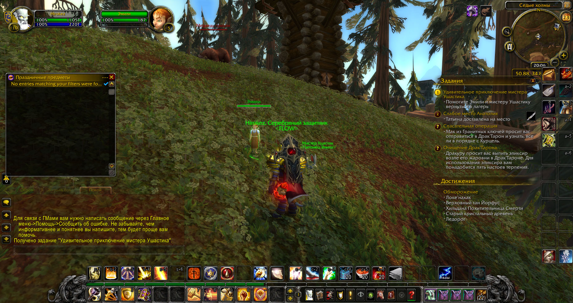 1. Беру квест. https://www.wowhead.com/wotlk/ru/npc=26588/%D1%8D%D0%BC%D0%B8%D0%BB%D0%B8 - 49.20 34.11 https://www.wowhead.com/wotlk/ru/npc=26589/%D0%BC%D0%B8%D1%81%D1%82%D0%B5%D1%80-%D1%83%D1%88%D0%B0%D1%81%D1%82%D0%B8%D0%BA - 49.23 34.11 2. Эмили и Мистер Ушастик выдвигаются 3. Эмили и Мистер Ушастик добираются до первого волка: Эмили - 50.81 34.84 Мистер Ушастик - 50.80 34.78 Волка нельзя ударить пока он не укусит Мистера Ушастика. После укуса, его можно ударить. НПС продолжают стоять на своих позициях из пункта 3 бесконечно долго. Не знаю почему, но они вернулись на место, где Эмили выдаёт квест. Хотя рестарта сервера ещё не было. |
