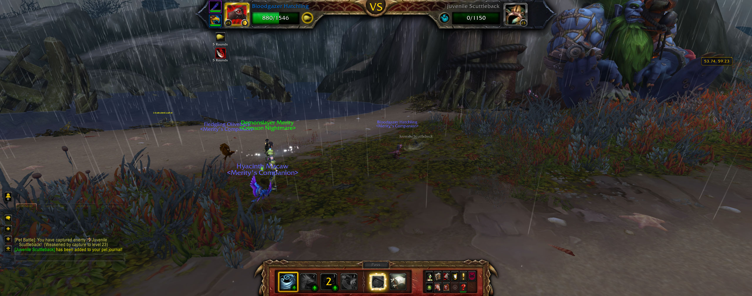 | Steps To Reproduce | 1. Get the bloodgazer pet 2. Follow his quests up to https://www.wowhead.com/quest=45010/hunting-lesson-juvenile-scuttleback 3. Find a https://www.wowhead.com/npc=97283/juvenile-scuttleback, battle it and win the battle. 4. There you go - quest wont progress. | ||||