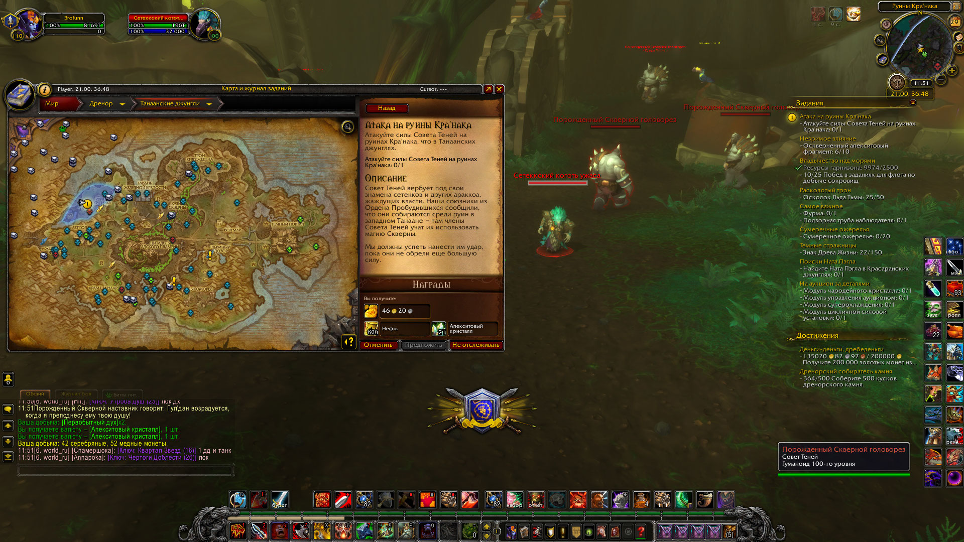 | Description | При взятии ежедневных квестов в Львином Дозоре для фарма нефти происходит постоянный баг. Прилетая на локацию квест не активируется, то есть не появляется полоска зачистки мобов. Прикрепляю ниже фото пример с квестом https://www.wowhead.com/ru/quest=38250/атака-на-руины-кранака#comments. Остальные квесты, которые есть в этом достижении имеют такую же ошибку, и из-за этого невозможен фарма нефти для развития гарнизона. | ||||