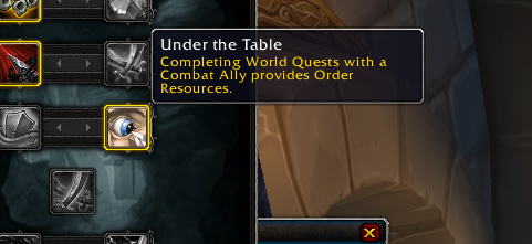 | Description | The order hall research https://www.wowhead.com/order-advancement=442/under-the-table doesn't reward any order resources when completing world quests while you have a follower. | ||||