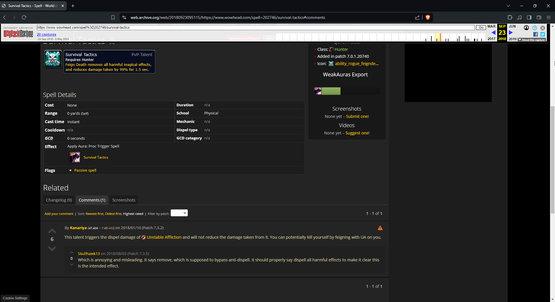 я даже не знаю, как на ваш вопрос начать отвечать. в каком смысле, "валилово без фактов"? инфо-коммент с wowhead для актуальной версии игры теперь совсем не факт? и... мне нужно предоставить информацию за другие модификаторы уменьшения входящего урона, и их взаимодействие с рассеиванием нестабильного колдовства? ну, я говорю за талант, по которому я сделал репорт. другие эффекты уменьшения урона от похожих способностей, например, подавление боли жреца, они крайне редко взаимодействуют с уроном от рассеивания нестабильного колдовства из за существенного кд этих способностей. просто невозможно такое отловить в видео, и не знаю я, как это проверять и доказывать. не знаю также всех нюансов механики этого таланта. может, вначале предпринимается попытка рассеять и нанести урон, а уже потом должен запуститься модификатор уменьшения урона, но этот момент мне невозможно узнать из обсуждений/видео. наверняка я знаю одно - у нас работает не по офу. если смущает, что инфо-коммент когда то там редактировали, то на archive.org есть сохранённая страничка, где он ещё без изменений. прикреплю скрин файликом. |