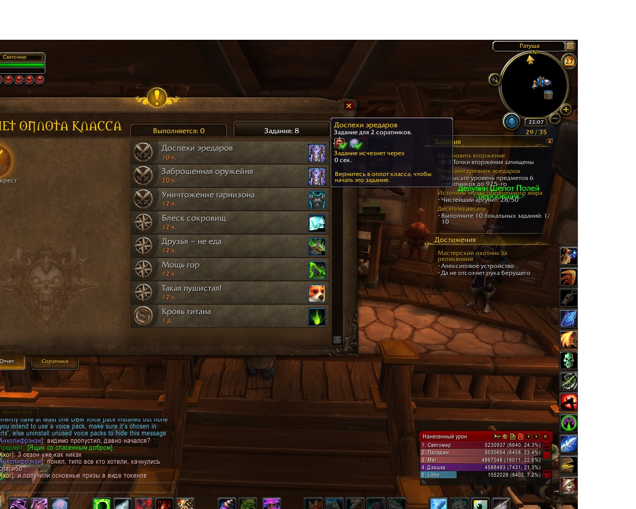 Эта проблема у меня у двух персонажей, причём с разных аккаунтов. Ники Богомир и Святомир. Причём когда я начал одним из них выполнять квест на броню эредаров, время выполнения квеста 10 часов, портанулся в гарнизон на Дреноре и сдал квест на столе заказов, было написано, что квест на броню эредаров завершён. На самом деле квест просто пропал, хотя ресурсы на его выполнение были потрачены и не вернулись. |