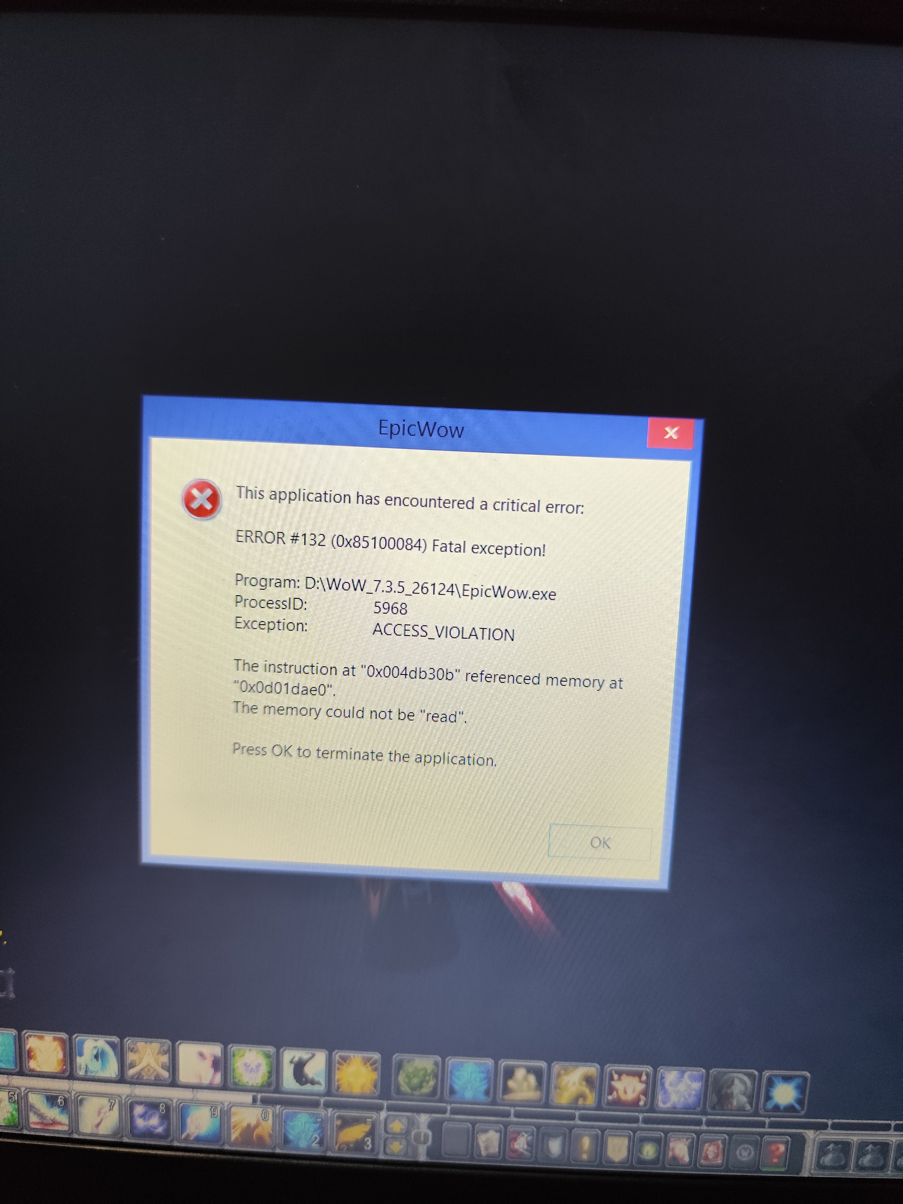 | Description | Во время прохождения подземелья ,в режиме эпохального ключа, происходит ошибка и вылет с игры. Эта ошибка происходит только вовремя ключа.Рейды и подземелья (об,гер,миф) работают нормально. Есть подозрение, что проблема в афиксе "злопамятный", а именно во время гибели мобов и появлении духов происходит сбой вызывающий эту ошибку с последующим вылетом. | ||||