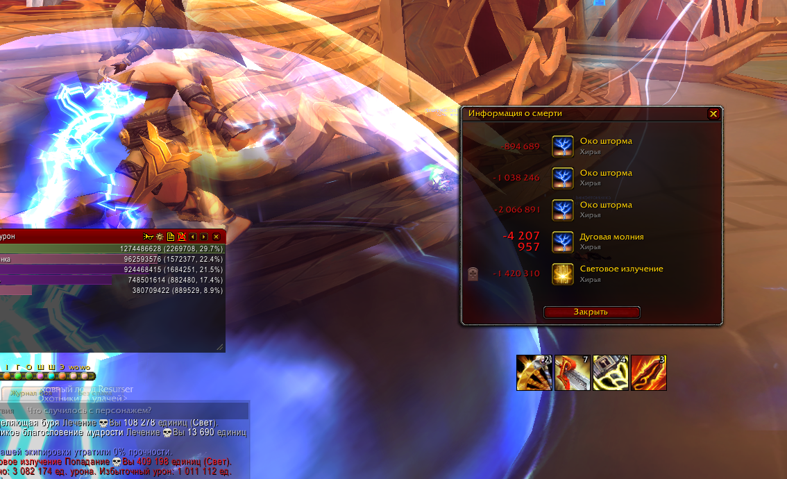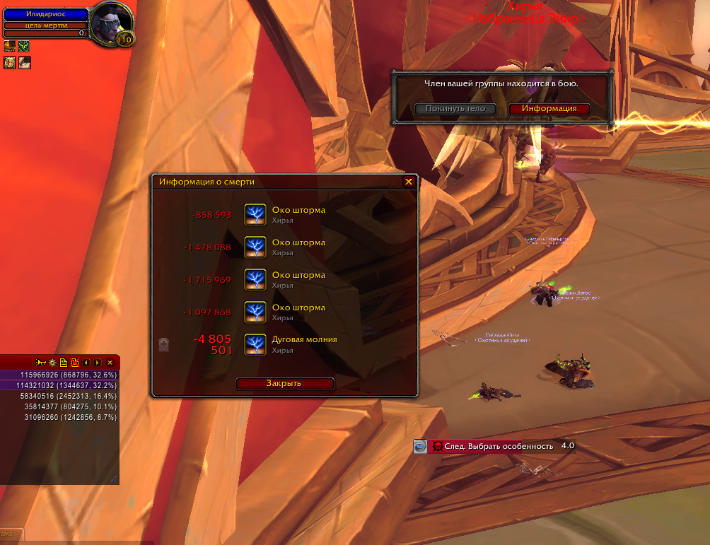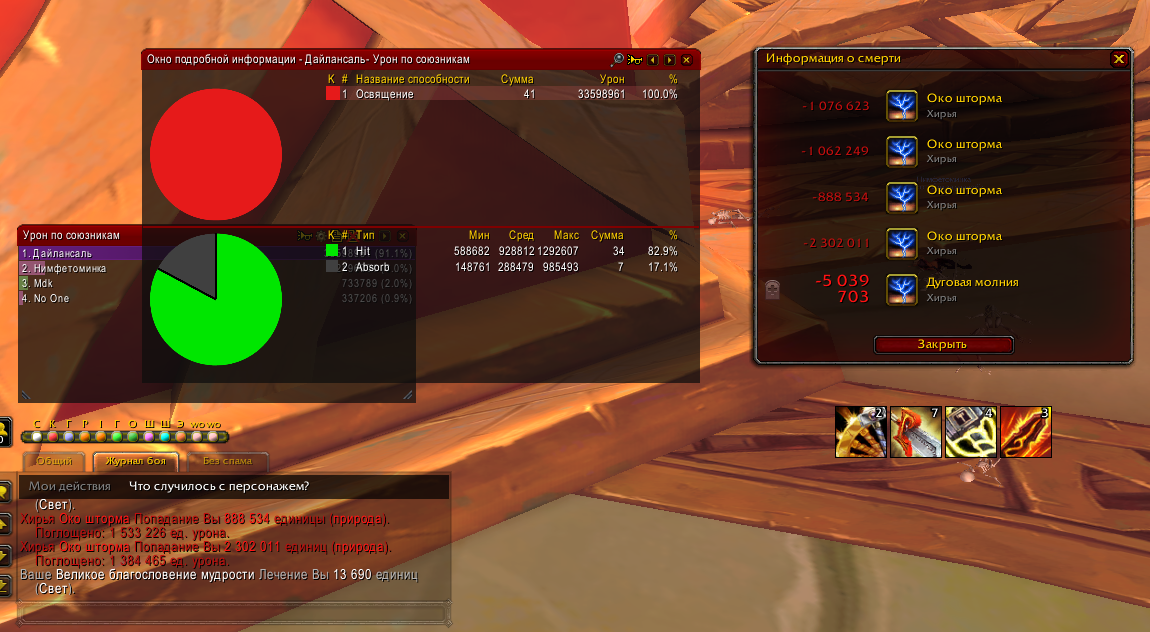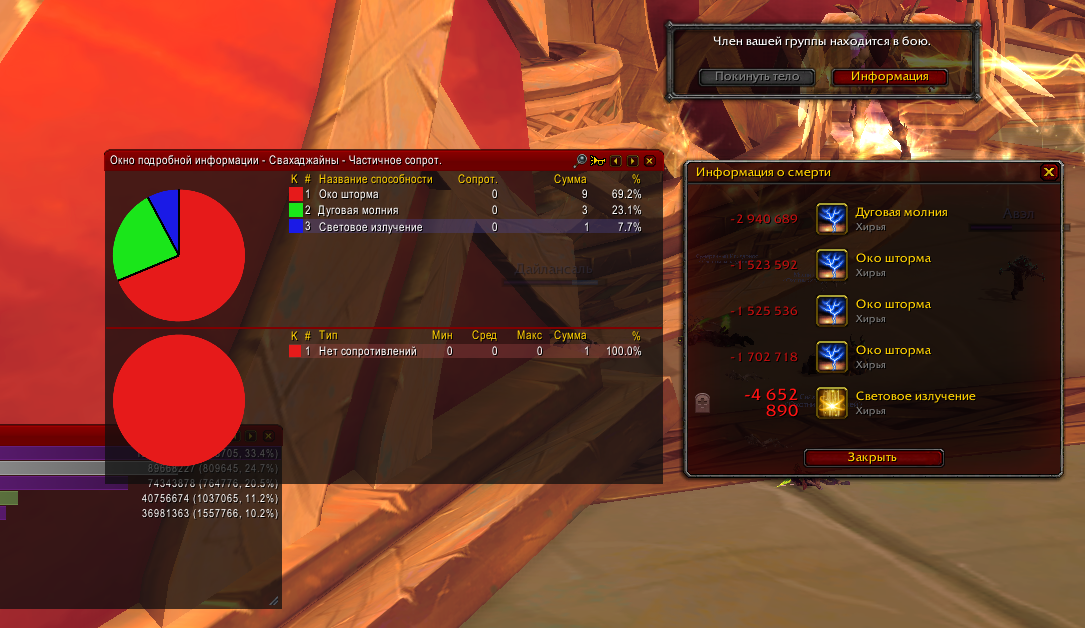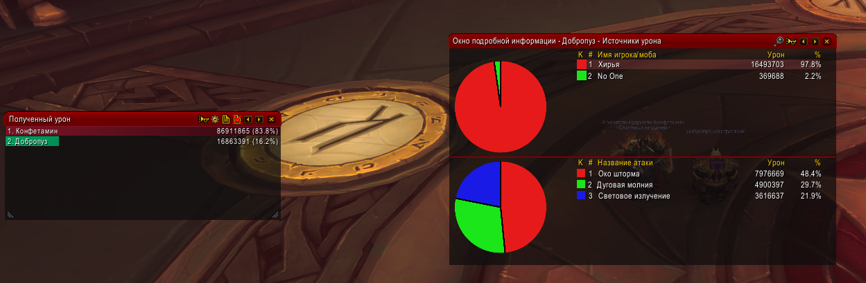 Сегодня проверял входящий урон в инсте в эпохальном режиме (не ключ). Под куполом дд получал урон, причем всегда во время каста https://www.wowhead.com/ru/spell=192305/%D0%BE%D0%BA%D0%BE-%D1%88%D1%82%D0%BE%D1%80%D0%BC%D0%B0 дд находился всегда под куполом, однако купол не помогал. На скриншоте видно, что большая часть полученного урона была от https://www.wowhead.com/ru/spell=192305/%D0%BE%D0%BA%D0%BE-%D1%88%D1%82%D0%BE%D1%80%D0%BC%D0%B0, почти 49%. На втором месте по входящему урону было https://www.wowhead.com/ru/spell=191976/%D0%B4%D1%83%D0%B3%D0%BE%D0%B2%D0%B0%D1%8F-%D0%BC%D0%BE%D0%BB%D0%BD%D0%B8%D1%8F, которая нанесла почти 30% урона. Получается что эти две способности босса наносят почти 80% урона в совокупности. При этом инст был запущен НЕ в режиме ключа. Соответственно, если на неделе будет тиранический афикс усиливающий боссов, то входящий урон по игрокам будет таким, что никакой хил не сможет помочь в данной ситуации и при этом не стоит забывать, что хил тоже будет получать большой входящий урон во время каста https://www.wowhead.com/ru/spell=192305/%D0%BE%D0%BA%D0%BE-%D1%88%D1%82%D0%BE%D1%80%D0%BC%D0%B0 и скорее всего умрет после попадания https://www.wowhead.com/ru/spell=191976/%D0%B4%D1%83%D0%B3%D0%BE%D0%B2%D0%B0%D1%8F-%D0%BC%D0%BE%D0%BB%D0%BD%D0%B8%D1%8F. |