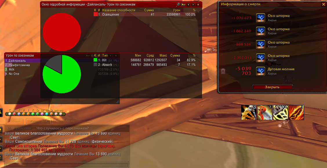 Вот еще один пример. В 17 ключе https://www.wowhead.com/ru/spell=192305/%D0%BE%D0%BA%D0%BE-%D1%88%D1%82%D0%BE%D1%80%D0%BC%D0%B0 работает не верно. Под куполом в дд прилетает 3.6 млн единиц урона, при этом поглощается только 1.3. Если подсчитать, то получается - урон от https://www.wowhead.com/ru/spell=192305/%D0%BE%D0%BA%D0%BE-%D1%88%D1%82%D0%BE%D1%80%D0%BC%D0%B0 равен 3.6 млн единиц урона. Купол поглощает 1.3 млн единиц урона. Итог - получается, что купол поглощает только одну треть всего урона, а должен поглощать 75%, согласно описанию на Вовхеде. Все цифры взяты из журнала боя, поэтому в них учитываются все афиксы ключа, бафы/дебафы на момент боя. И на одном из скриншотов видно, что https://www.wowhead.com/ru/spell=191976/%D0%B4%D1%83%D0%B3%D0%BE%D0%B2%D0%B0%D1%8F-%D0%BC%D0%BE%D0%BB%D0%BD%D0%B8%D1%8F, наносит полный урон только в одного участника, в моем случае это чуть больше 5 млн единиц хп. |
