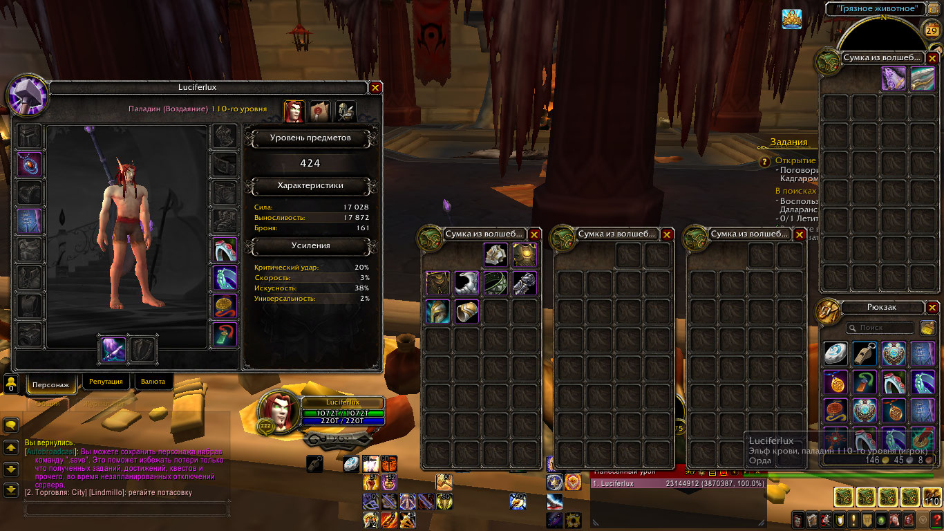 | Description | На старте нового аккаунта выдаются 110 уровень и вещи значения 910. Проблема состоит в том, что ВСЕ вещи кроме колец, амулета, оружия, плаща и аксессуаров дают ТОЛЬКО защиту. Подробнее в скринах. | ||||