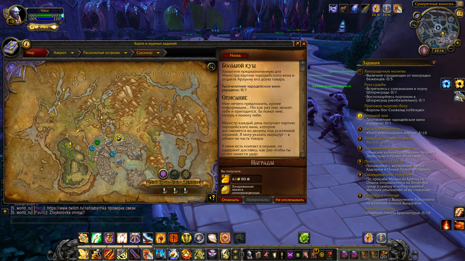 | Description | По квесту нужно добыть предмет «Тысячелетнее чародейское вино», но бочонок с ним не появляется в нужном месте. Убийство рядом стоящих мобов, которые подсвечиваются как необходимые для задания, не даёт результата. Квест необходим для прохождения сюжета Сурамара. Сервер Legion x100, персонаж - Vlatar. | ||||