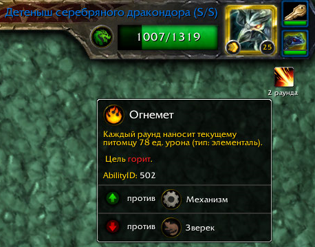 38. https://www.wowhead.com/ru/pet-ability=519 в данный момент ставит дебафф только на свою команду, а метеорит через 15 раундов падает только на противника. Должен быть дебафф на обе команды и метеорит через 15 раундов с обеих сторон. |