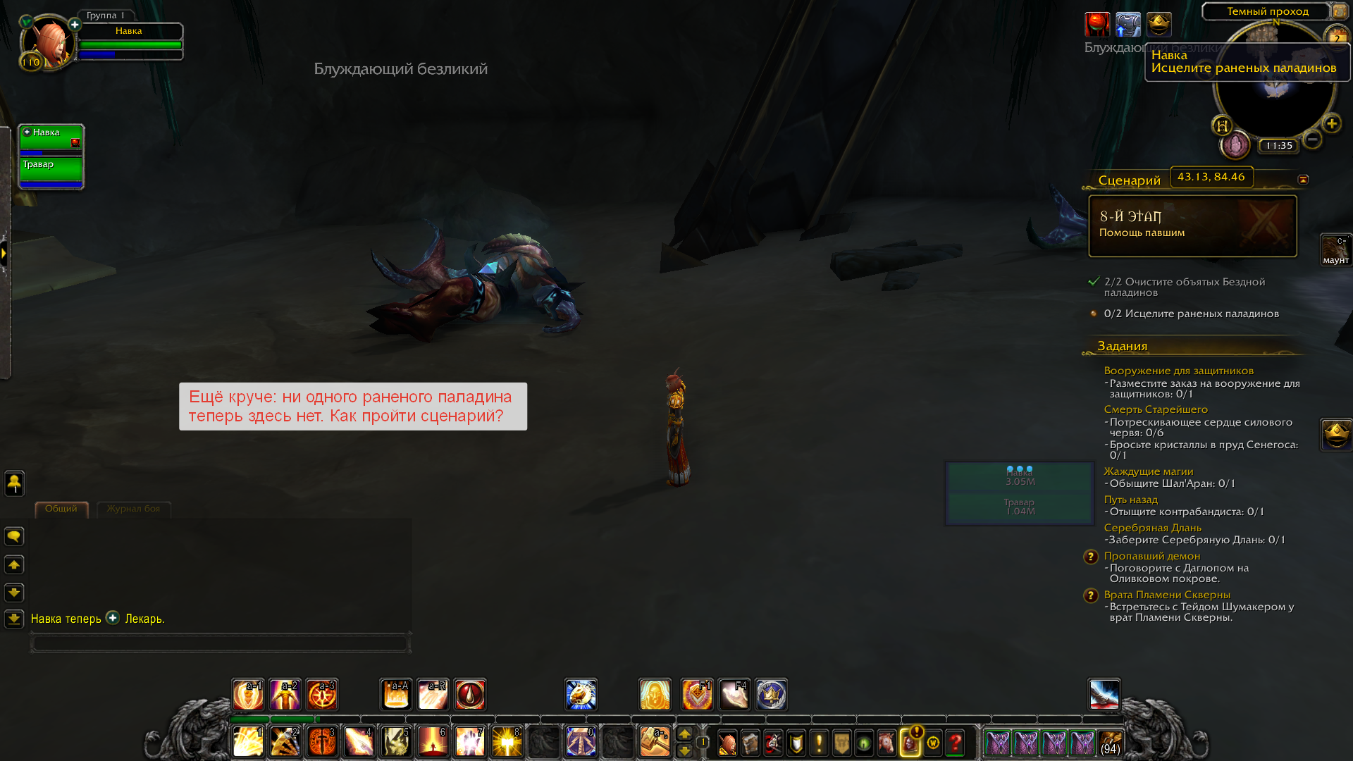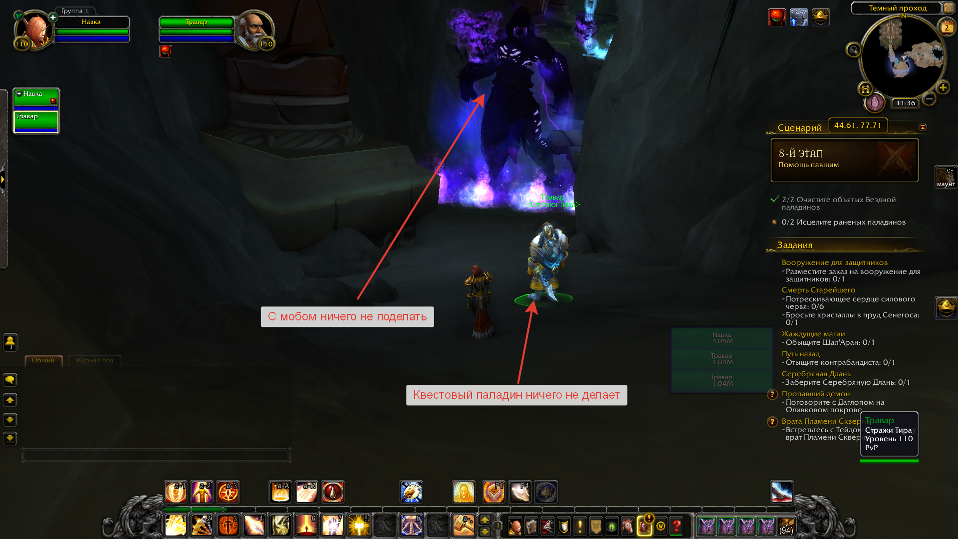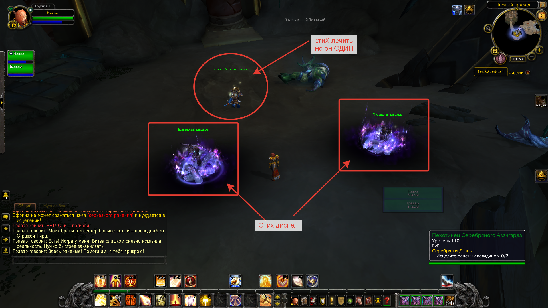 | Description | Паладин, Орда Сценарий артефакта "Серебряная Длань". Часть в Тирисфале. Этап 8 Требуется по сценарию 1) сдиспелить магию с двух паладинов 2) исцелить двух раненых паладинов Проблема 1) сдиспелить магию = нет проблем, в спеке хила Очищение работает прекрасно 2) раненый паладин всего ОДИН, исцеляется и уходит; второго паладина НЕТ = задание выполнить невозможно Сценарий висит. | ||||
