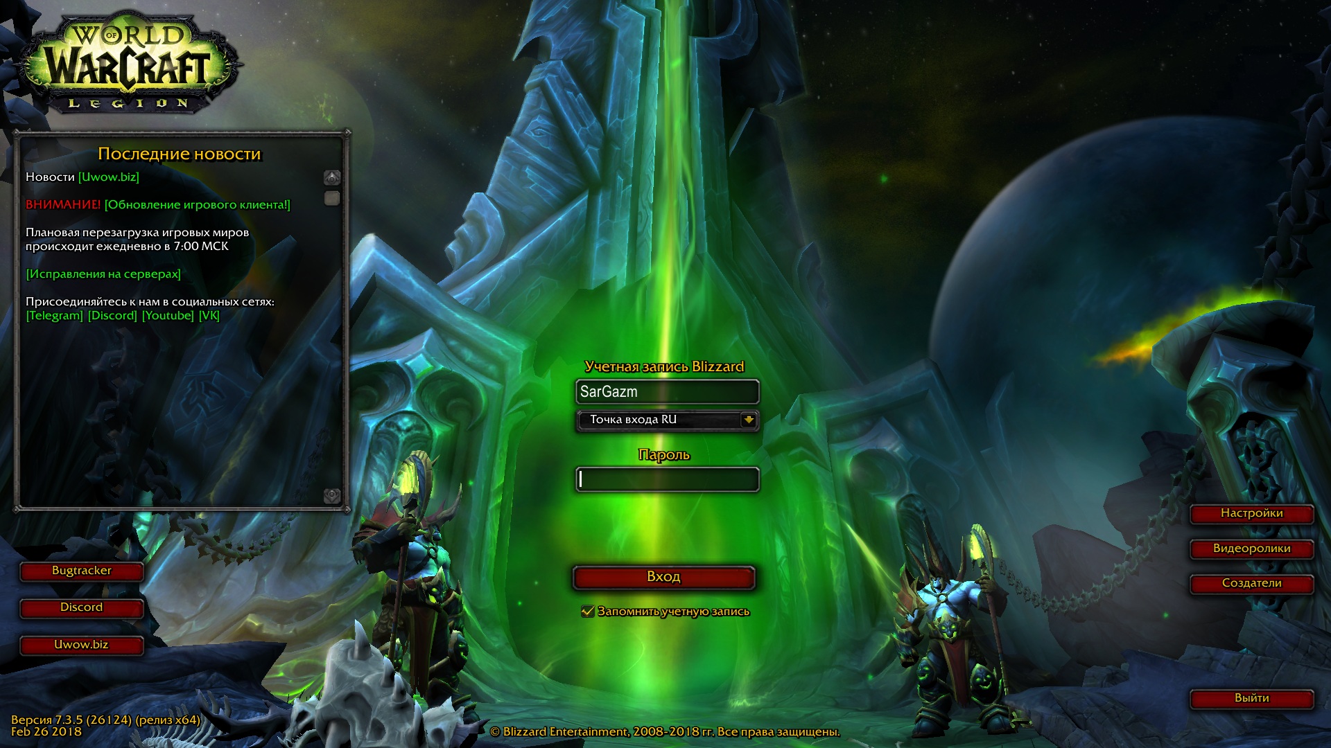 | Description | Во время входа в игру не загружает экран персонажей В редких случаях после удачной попытки зайти в игру - выбрасывает через 0.5-2 минуты | ||||