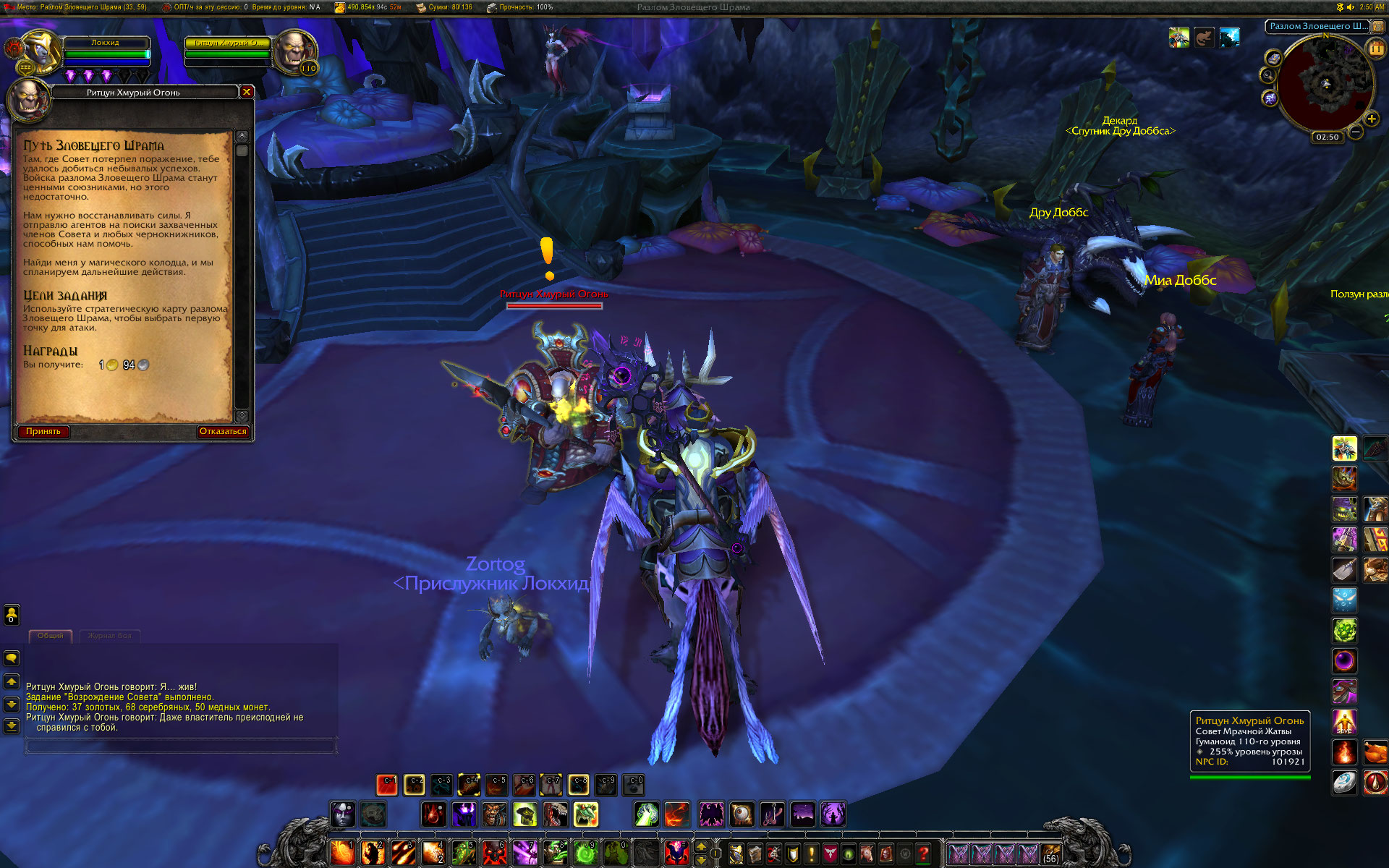 Тушка появляется по принятии квеста https://ru.wowhead.com/quest=40823 у чернокнижников. Может быть, пошел не в ту сторону :) и на правильном месте возле карты стоит правильный НПЦ. По сюжету кампании оплота этого НПЦ нужно оживить, завершив на нем квест https://ru.wowhead.com/quest=40823 , сразу после чего он выдает квест https://ru.wowhead.com/quest=40824 Путь Зловещего шрама . Мне этот квест получилось сдать ему же на месте, даже не тыкая в карту и не выбирая сюжетку. Обратите внимание, что у меня он почему то нашелся не возле карты, а на координатах 32, 60 . Они есть на экране (левый верхний угол) , да и площадка специфическая видна на скриншоте. НПЦ исчезает сразу после сдачи квеста https://ru.wowhead.com/quest=40824 , потому и обозначено как пустяк. Как то одетого 110 лока НПЦ практически не пробивал, не знаю как это бывает у 98 чаров, может более ощутимо. |