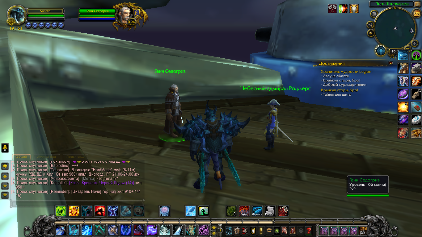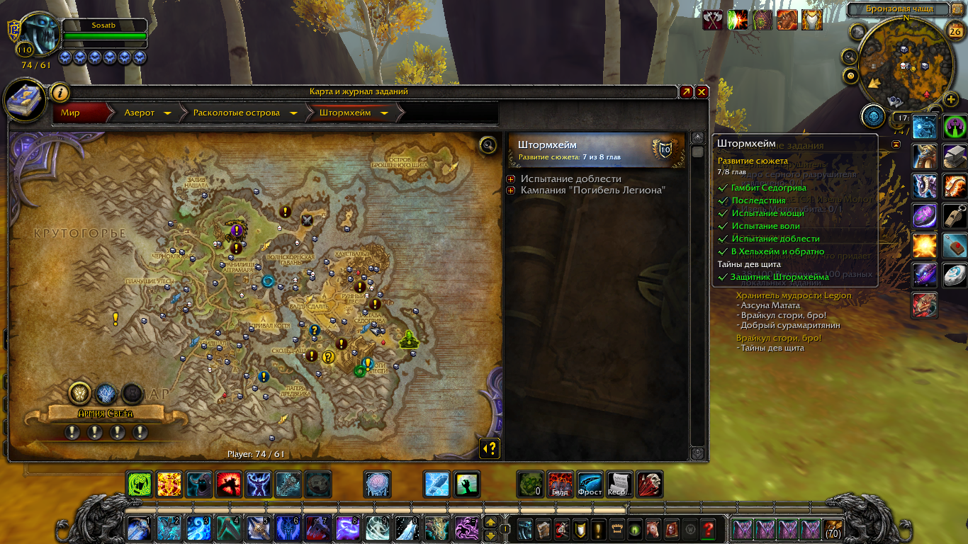 ну ситуация такая у меня выполнены все главы штормхейма кроме 7 на серве есть исправления в дебагера именно квестов гамбит седогрива и следующего после него но гамбит седогрива у меня не пройден но главу защитало и дало ачиву, я еще предполагаю что я что то пропустил для начала цепочки на 7 главу но пока что я информации в интернете не нашел по поводу сопутствующих квестов началу 7 главы в крайнем случае попытаюсь пройти все локации и если до того времени не будет нпс буду писать админам и еще если можно напишите название аддона который покажет послед квестов и критерии для начала буду благодарен за уделленое время |