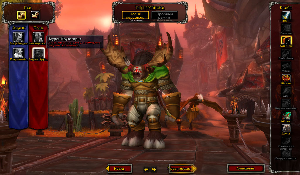 Получить любым персонажем достижение Горы по колено. Добиться того что бы Племена Крутогорья вам Превозносили. Достижения и репутация привязываются к учетной записи. Дальше вам необходимо посетить персонажем за Орду посольство в Оргриммаре, где вам придется выполнить несколько заданий и сценарий. После выполнения вы сможете создавать Тауренов Крутогорья на вашем сервере. |
