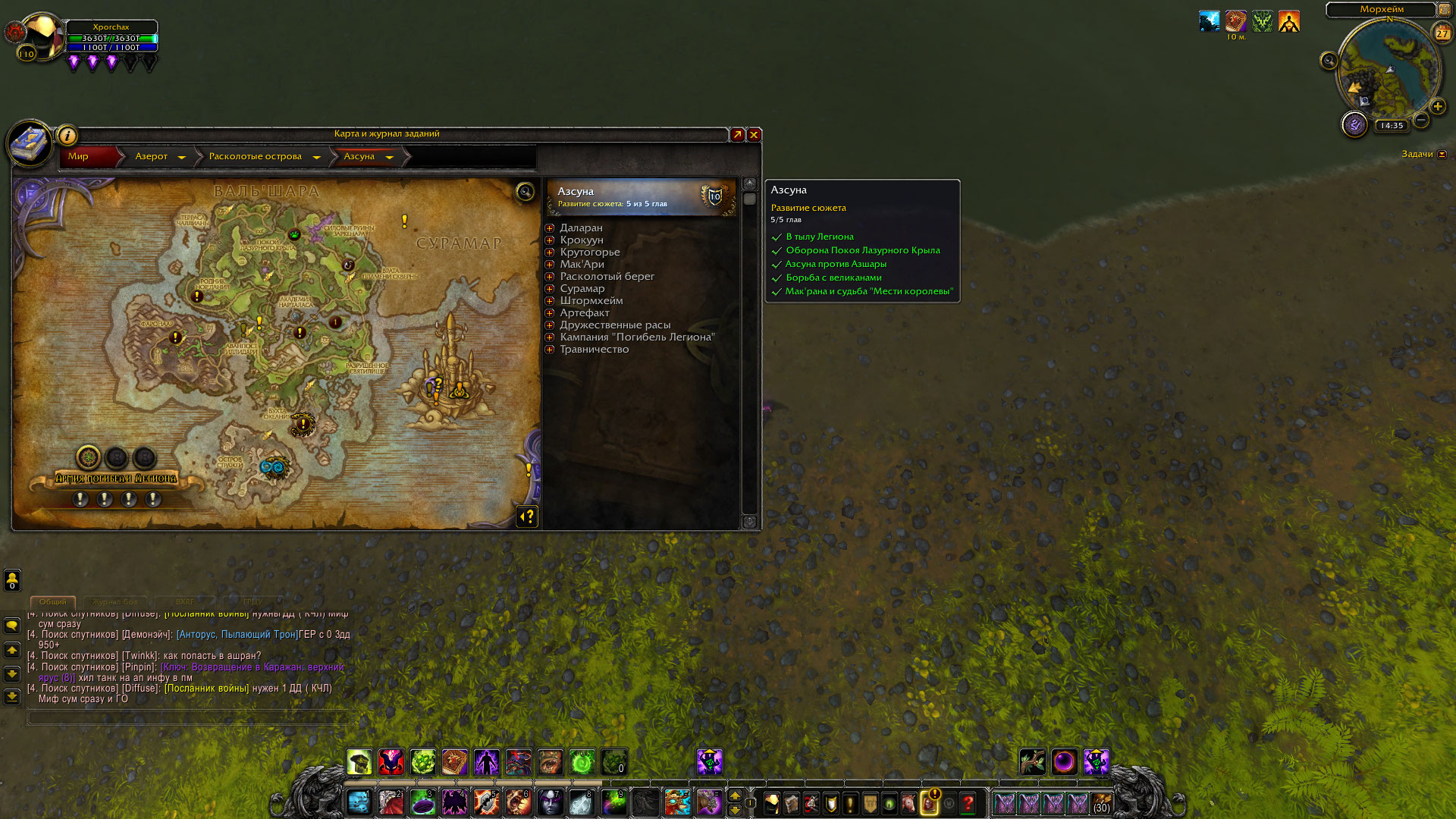 Поправка: на мобах только до уважения. Дальше локалки, задания посланника. И да, то, что у Вас автоматически "зачлись" все цепочки сюжетки может быть следствием того, что сюжетку Азсуны Вы выполняли ранее на другом персонаже. Достижения общие на аккаунте и вот так вот срабатывает общность. То есть наличие птиц на списке критериев рядом с картой - не доказательство того, что на конкретно этом персонаже сюжетка выполнена по факту. Если персонаж первый - "основа" - просто добивайте репутацию локальными заданиями и заданиями посланника, не упускайте полезный период, проходящий под "знаком Посланника" - в этот период репа идет с бонусом +50%. Отдавайте предпочтение синим и фиолетовым локальным заданиям, за них намного больше репутации дают. |