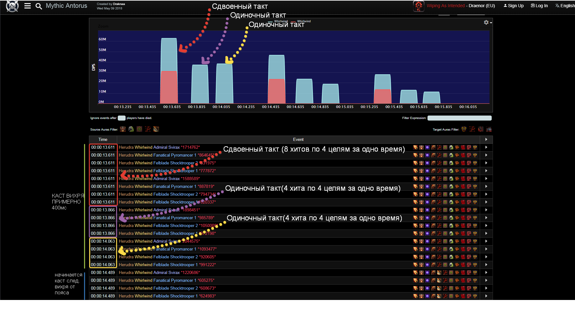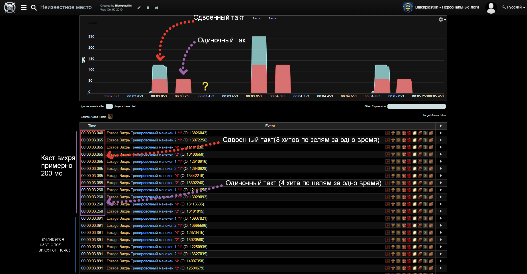 Признаюсь,я был запутан ситуацией,таймингами и задержками и в одном из своих суждений пришел к неверному выводу по поводу Доп.такта вихря,это и в правду было трудно понять по логам,да еще и с учетом того,что у нас пояс реализован в корне по-другому,Пояс и вправду должен добавлять только доп.такт в вихре,а не кастить дополнительный вихрь,и понял я это только сегодня,когда на скорости 0.25 из реплея высматривал расходуется ли рага война при касте каждого вихря,и,да,она расходуется,это значит,что вихрь не дает бесплатных дубликатов,он просто добавляет один такт,до этого я думал что Вихрь дает и доп такт и бесплатный дубликат,но это не так |