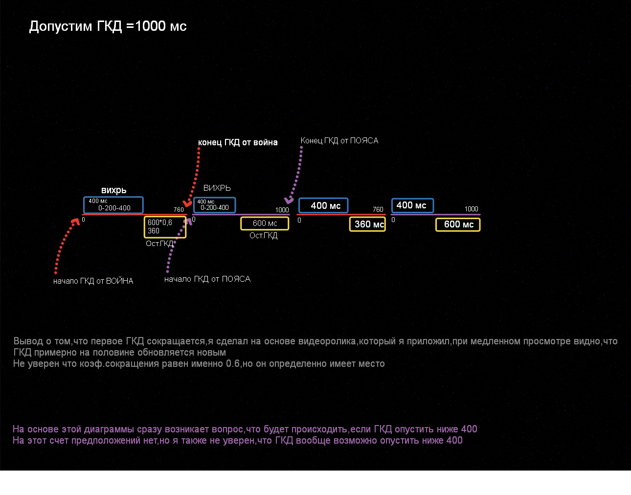 Нет,он должен произноситься через время,просто это время должно равняться оставшемуся ГКД Война,то есть так Воин дает Вихрь,одновременно с этим запускается ГКД,вихрь проходит за 400мс,дальше происходит завершение ГКД и запускается еще один каст Вихря с пояса то есть 400+оставшееся ГКД+400, и снова я полез серчить все логи и БИНГО нашел нужный момент https://www.youtube.com/watch?v=-a1etGgTpHY& Если в этом ролике во время файта на 18:05 обратить внимание на каст панель война,то можно увидеть, что у него дубликат вихря от пояса тоже вызывает ГКД(он жмет на кнопку вихря,начинается откат по ГКД,и где-то на половине или ближе к концу у него таймер ГКД снова обновляется,хотя он сам ничего не нажимал,он бы банально не успел бы ничего нажать,значит это ГКД запускает его легендарка,которая дает вихрь) А значит что каст должен выглядеть примерно так "Собственный каст вара 400мс+оставшеесяГКД(но судя по-всему оно не полное,где-то 3/5 от оставшегосяГКД)+Каст вихря с пояса 400мс + оставшееся ГКД(которое уже тригерит не сам вар а легендарный пояс) Допустим,наше ГКД будет равно 1000мс,тогда 400мс +(600*3/5)мс +400мс+600мс и так по кругу или формула чуть проще для восприятия "ВИХРЬ ОТ ВАРА +(600*3/5)мс + ВИХРЬ ОТ ПОЯСА +600мс"и так по кругу или формула еще чуть проще "ВИХРЬ ОТ ВАРА +(оставшеесяГКД*3/5)+ВИХРЬ ОТ ПОЯСА +оставшеесяГКД" и так по кругу Это значит что у нас вихрь начинает пропадать,накладываться и отменять сам себя просто потому ,что каст от пояса не вызывает ГКД http://egammi.net/image/SZM7 |