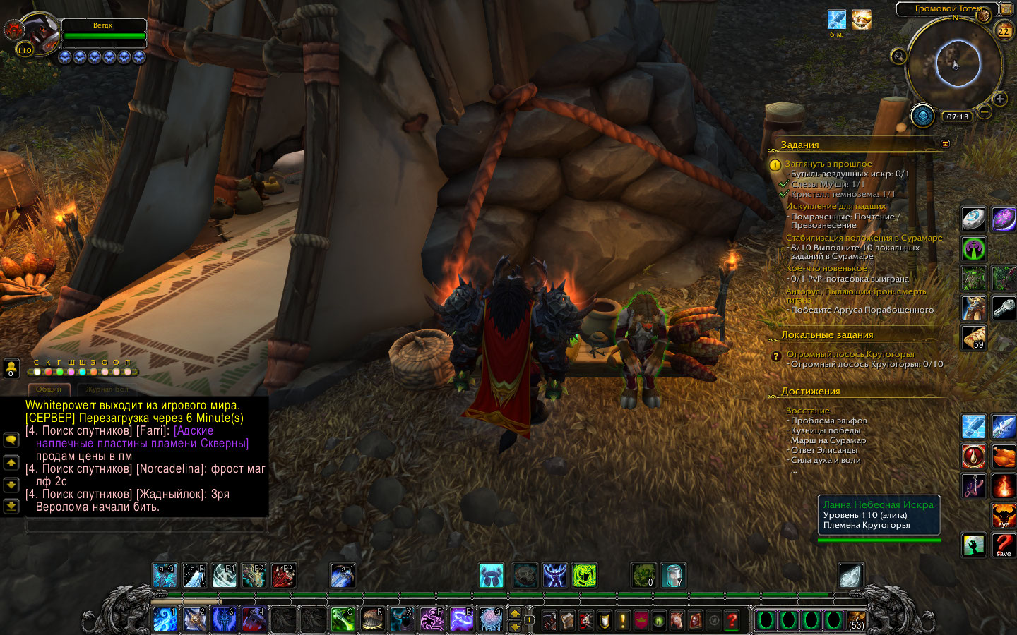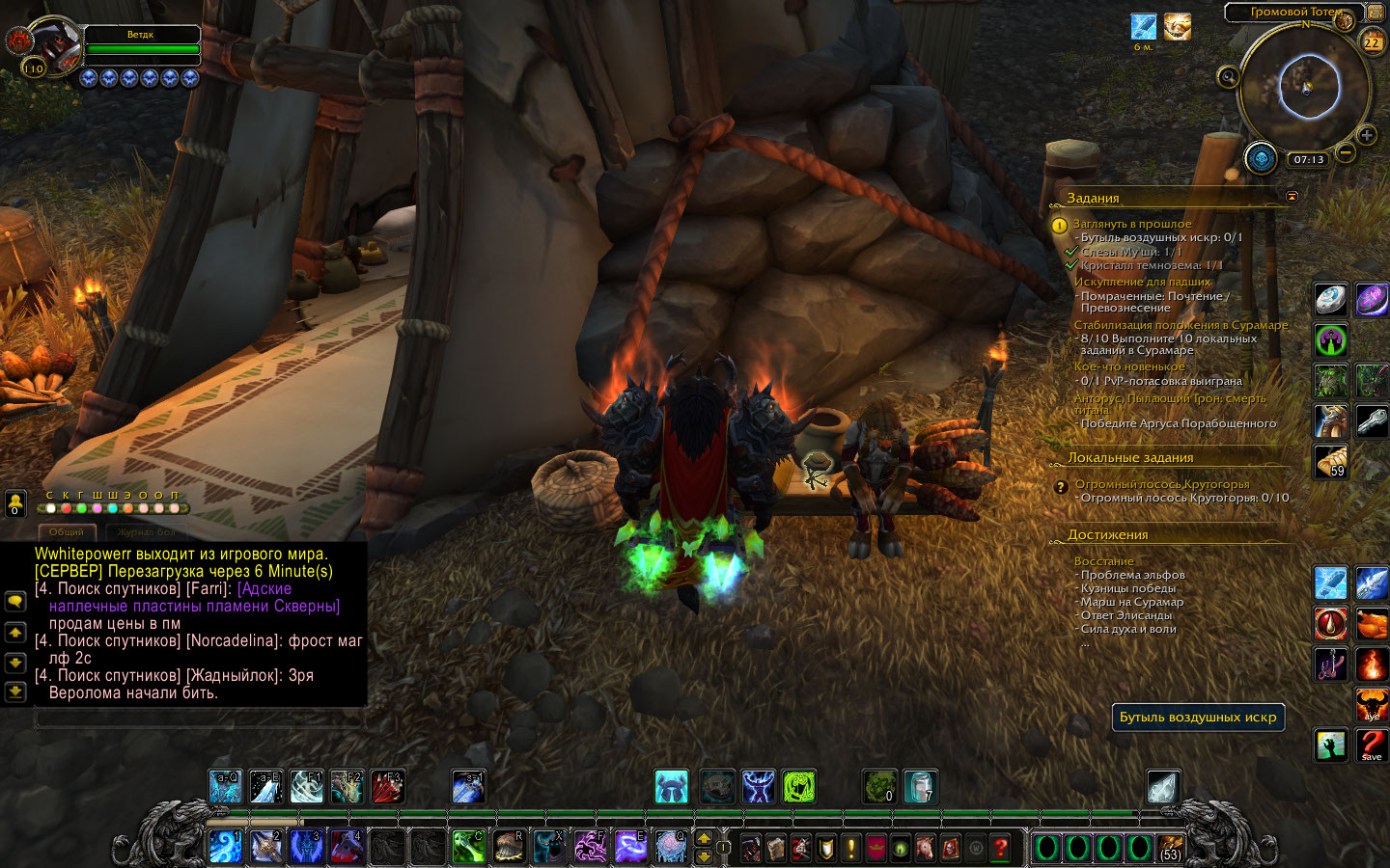 Так и должно быть, надо было погуглить прежде чем создавать это все Координаты вводим в Громовой Тотем /way 35.44, 23.74 - Бутыль воздушных искр покупаем у Ланна Небесная Искра /way 57.37, 10.48 - Слезы Му'ши внизу водопада Координаты вводим в Крутогорье /way 45.16, 53.49 - Кристалл темнозема юзаем кристалл, появляется Бурлящий дух живой ярости, с него падает итем |