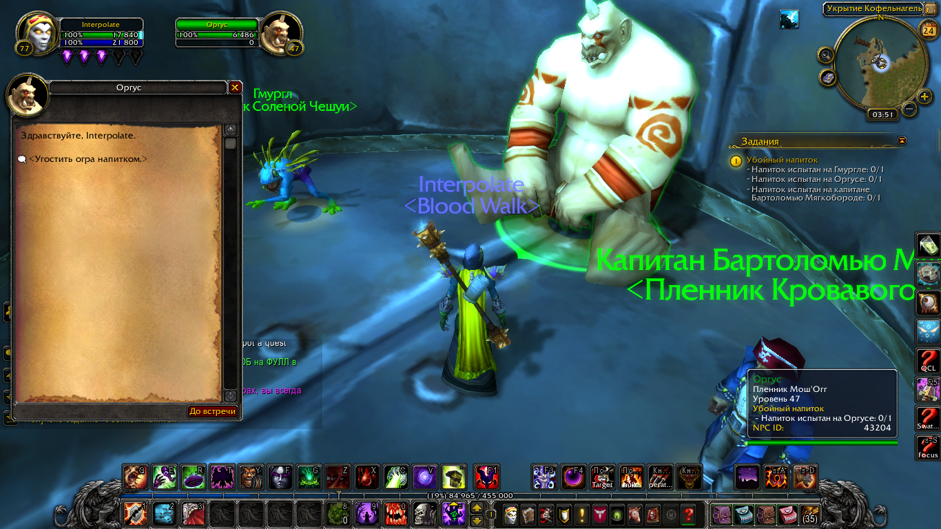1. На https://ru.wowhead.com/npc=43203 действует отбрасывание от взрыва https://ru.wowhead.com/npc=43204 , видимо его просто в прошлый раз выкинуло вниз, из-за чего он не респавнился и не находился через /target по всей территории квестхаба. 2. С https://ru.wowhead.com/npc=43205 же вообще нельзя взаимодействовать, ни кликом, ни через бинд. |
