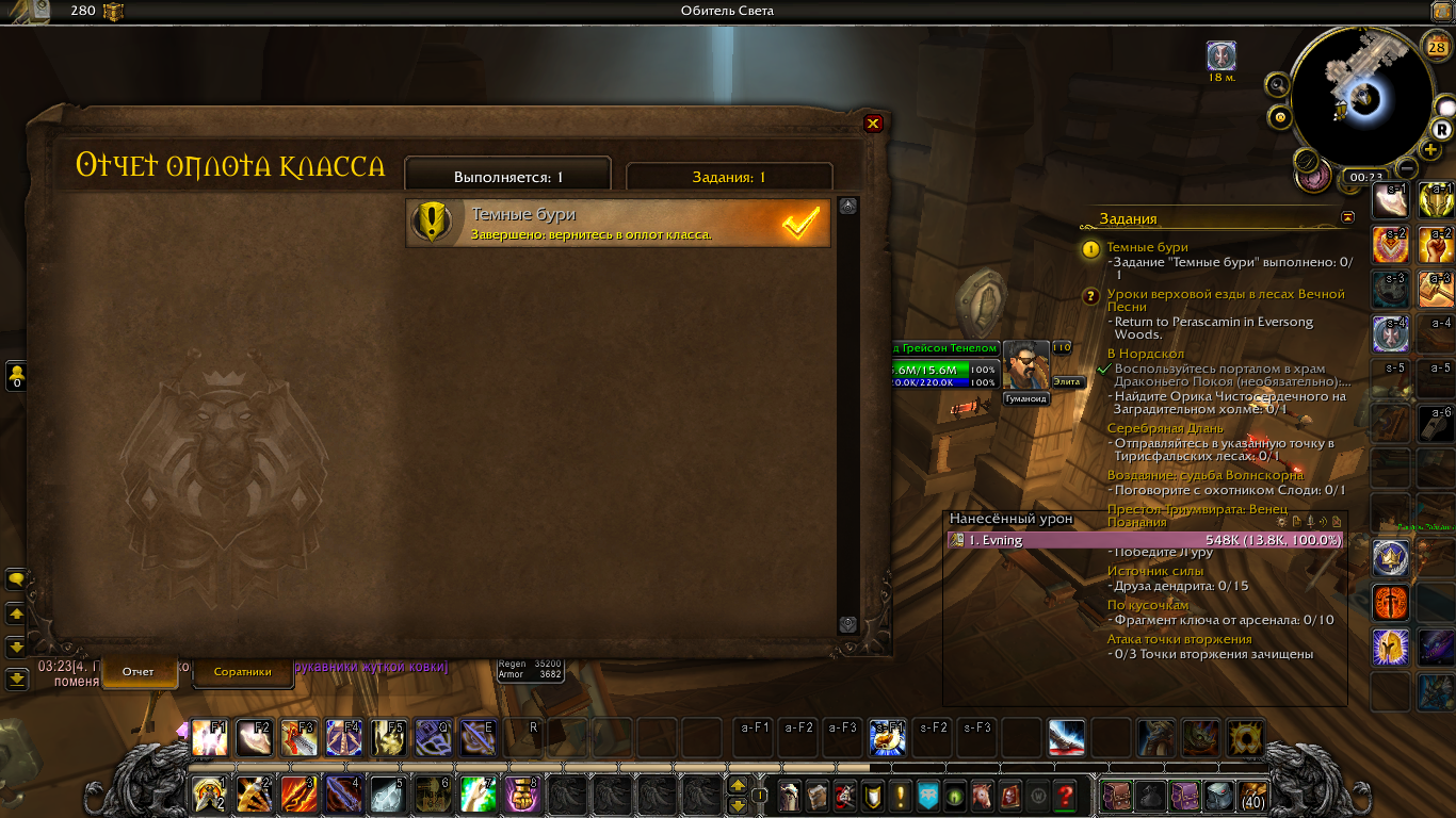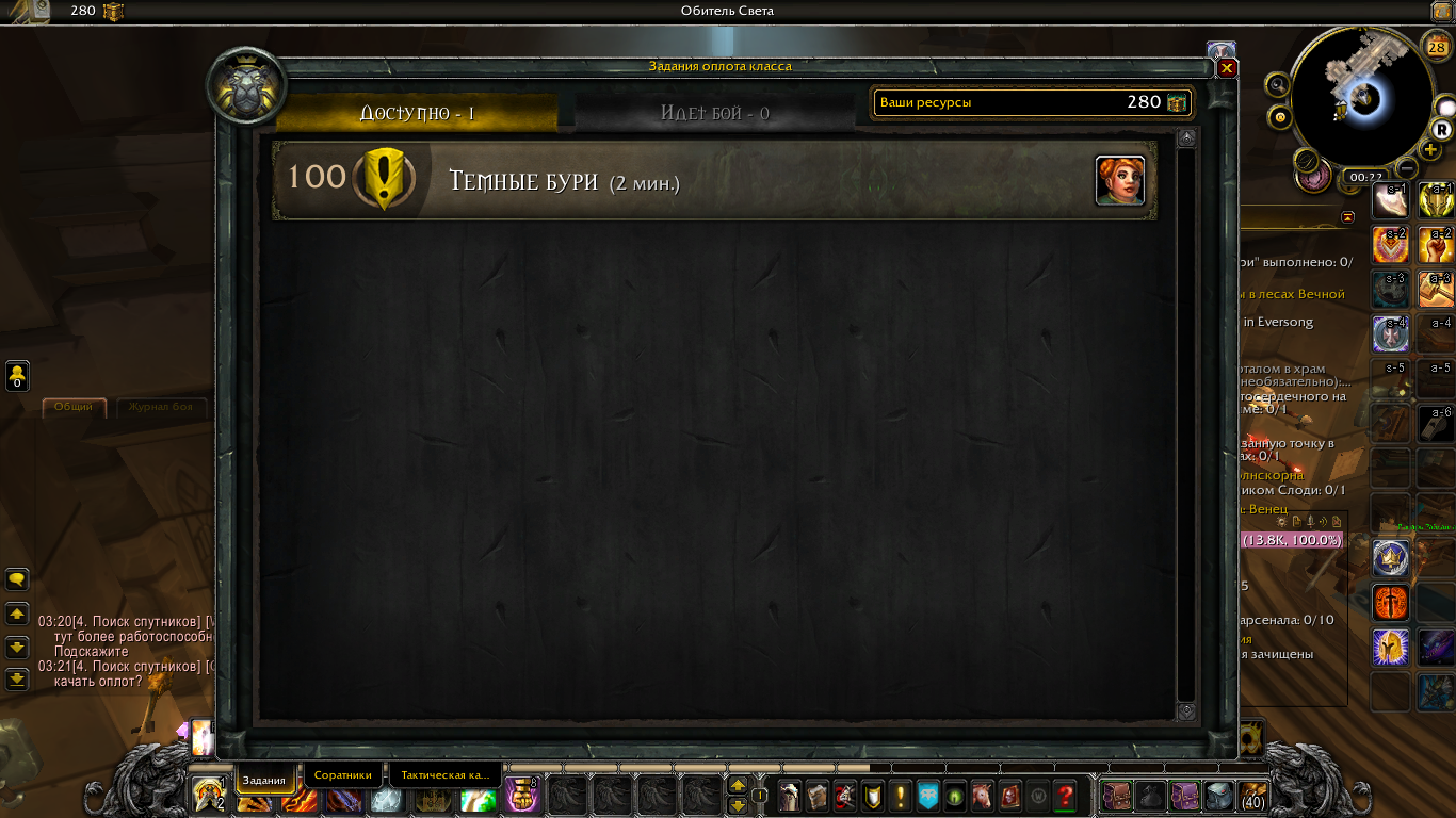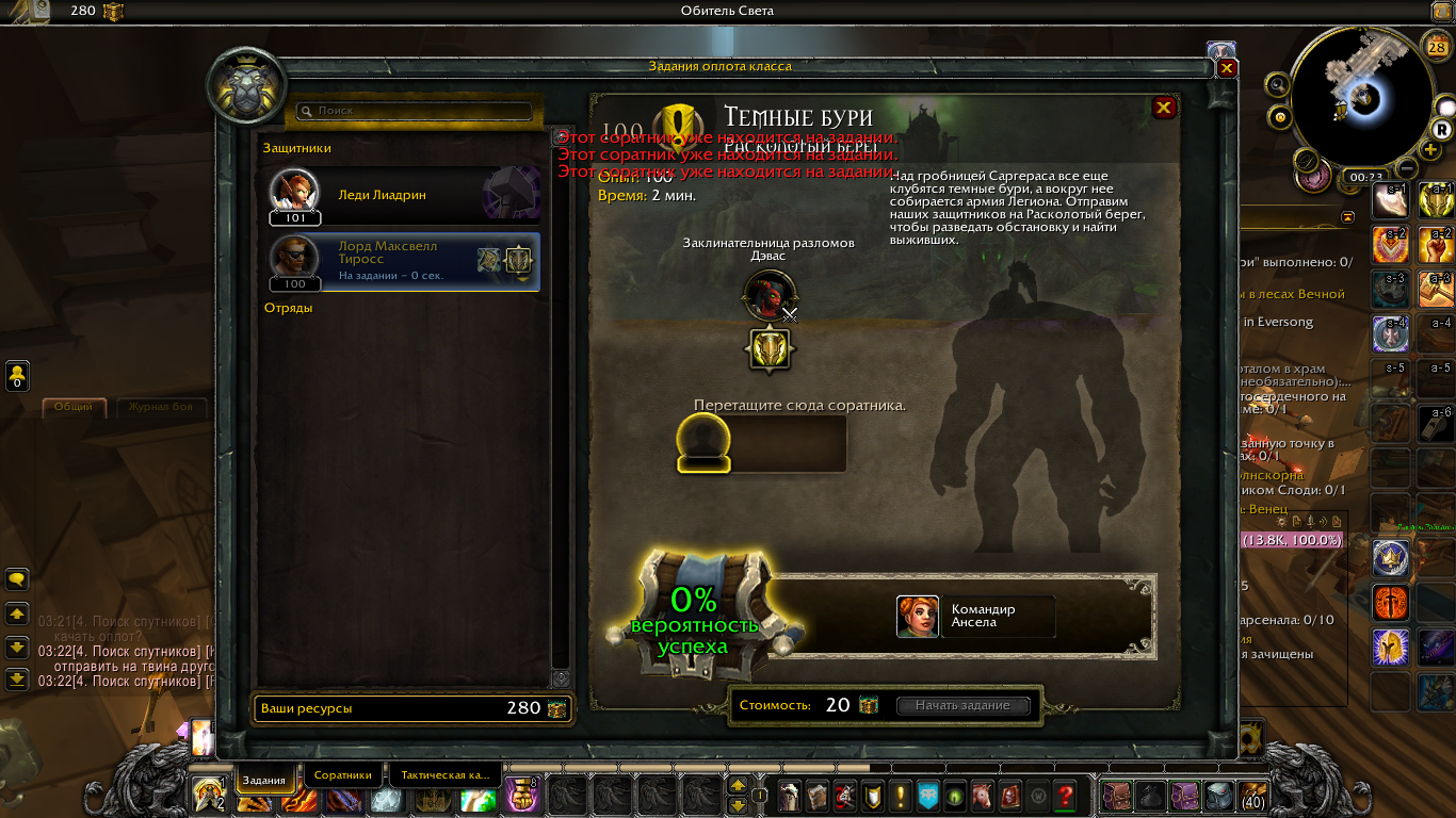 | Steps To Reproduce | В процессе выполнения квеста "Темные бури" произошло следующее: взял квест у нипа Лорд Грейсон Телелом, подошел к Тактической карте для выполнения квеста, выбрал задание на доске "Темные бури" (к слову, это самый первый квест для Тактической карты в оплоте), спустя 1 мин задание в Тактической карте завершилось, нажимаю на "забрать награду", но кнопка не нажимается. Принял решение перезайти в игру, но выполненный квест вовсе пропал с Тактической карты. Появился новый квест " Темные бури", точно такой же квест, но дело в том, что для его выполнения необходимо выставить защитника Лорда Максвелл Тиросс, но у меня пишет:" Этот соратник находится на задании ". Однако, открыв "Отчет оплота класса" (иконка у мини-карты) во вкладке "Выполняется: 1" стоит тот самый квест, с которого не мог забрать награду "Темные бури. Завершено: вернитесь в оплот класса." Конечно, подойдя к Тактической карте у меня нет никакого выполненного квеста "Темные бури" | ||||