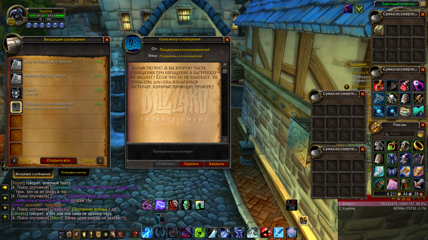 | Description | Забагался квест в цепочке квестов у ДК, не смог пройти. Был в сюжетной ветке. меня суманули в другую локацию, я достиг 110 уровня. и у меня не доступный руны у дк. и т.д. так как я цепочку сюжетки не прошел. а пройти я её не могу, потому что нужно воспользоватся порталом врата смерти. а меня при открытии врат смерти тпшит в новый ополот класса. как пройти цепочку на дк теперь? завис на квесте 13165 (возвращение в Акерус) ник yuummy логин Karonis Реалм х100 легион | ||||