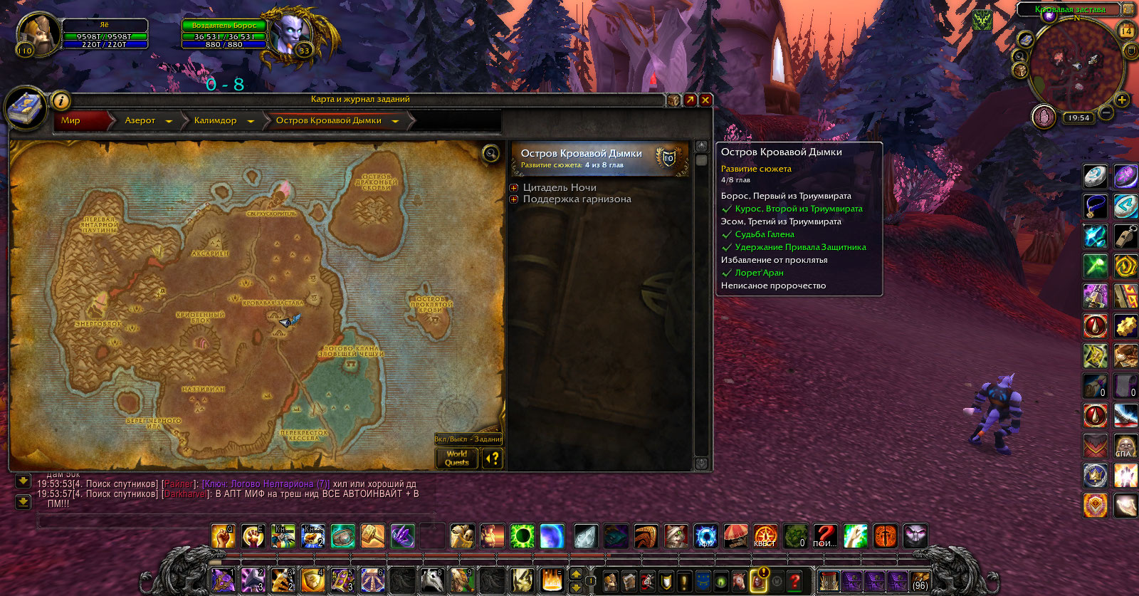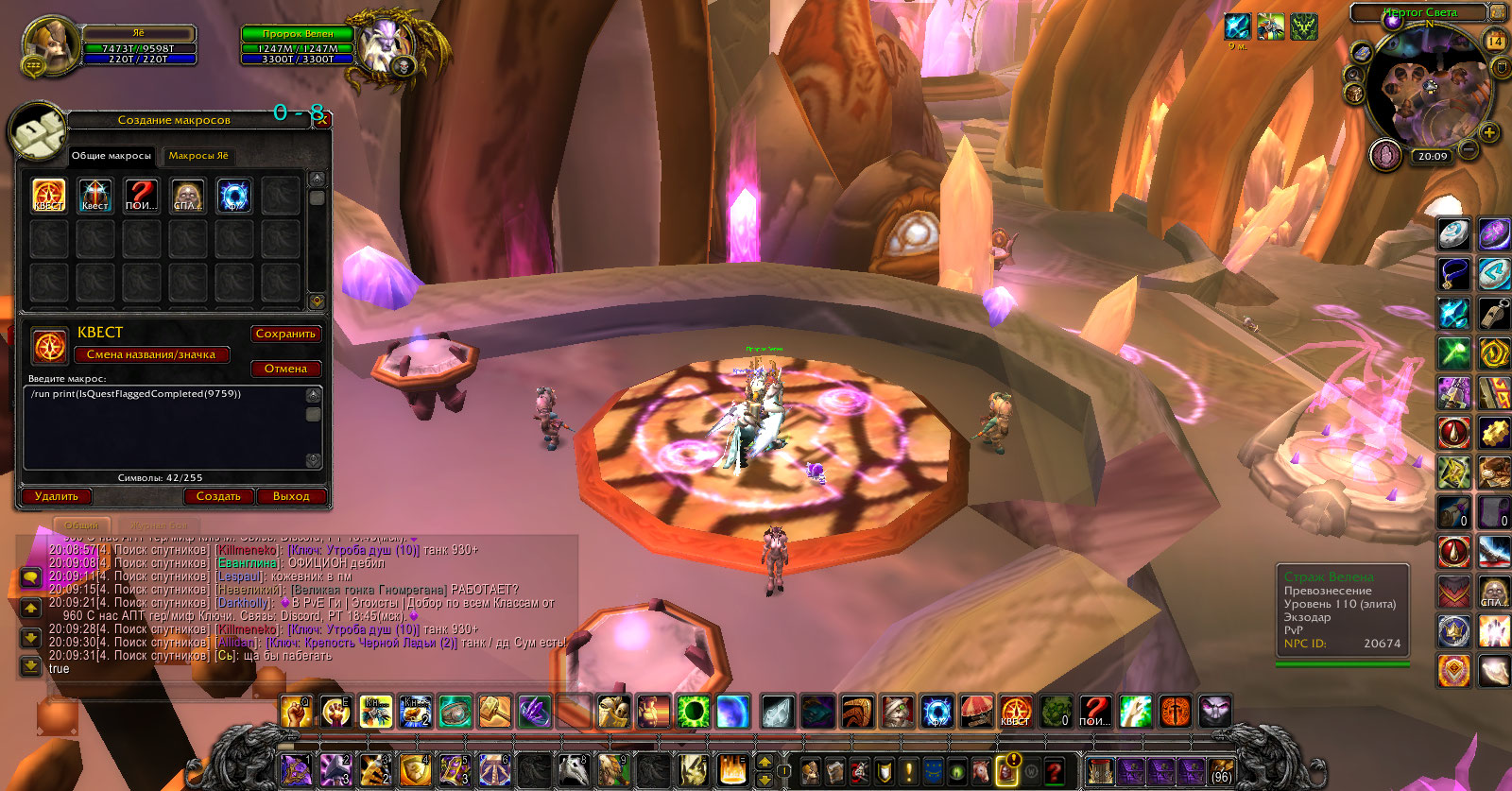 Это почти все квесты с расовым ограничением для дренеев. Остальные же сделаны. Дренейские квесты не нужны для ачивки. Вот серия, нужная для ачивки, из коммента на вовхеде: 1. Что для тебя Аргус?.. 2. Кровавая застава 3. После кровавой заставы становится доступна небольшая цепочка квестов: Дневник Галена: судьба воздаятеля Саруана->Матис Жестокий 4. Перехват сообщения 5. Переводы... 6. Аудиенция у Пророка 7. Правда или вымысел 8. Магия против Тьмы 9. Криогенный блок 10. Не пей эту воду! 11. Границы возможного 12. Солнечные Ворота ___ДЛЯ ВСЕХ КРОМЕ ДРЕНЕЕВ ЗДЕСЬ ЦЕПОЧКА КВЕСТОВ ЗАКАНЧИВАЕТСЯ. А для дренеев есть дополнительные квесты: 1. Отречемся от старого мира 2. Неписаное пророчество Первых три квеста нормально всё работают, а вот уже четвертый - https://ru.wowhead.com/quest=9779/ нельзя взять. (Это первый критерий локации). У Эсома https://ru.wowhead.com/npc=17844 тоже нет квестов, хотя предыдущие пройдены, кроме первого критерия (третий критерий). У Гермесиуса https://ru.wowhead.com/npc=17703 тоже нет квеста. В лагере у https://ru.wowhead.com/npc=17240/ тоже все квесты выполнены. (шестой критерий). Последний критерий вовсе пройдён, но не зачтён. Скриншот с ачивкой. Скриншот с Боросом без квеста, так же видно, что и у Эсома, стоящего рядом нет квестов. Скриншот с Гермесиусом без квеста. Скриншот с Одиссием, у которого опять же нет квестов. Скриншот с квестом 9759 https://ru.wowhead.com/quest=9759/ последний критерий для ачивки https://ru.wowhead.com/achievement=4926/ . True, то есть пройден, но критерий не зачтён. Не для одной из этих цепочек не нужна раса дренеев. |