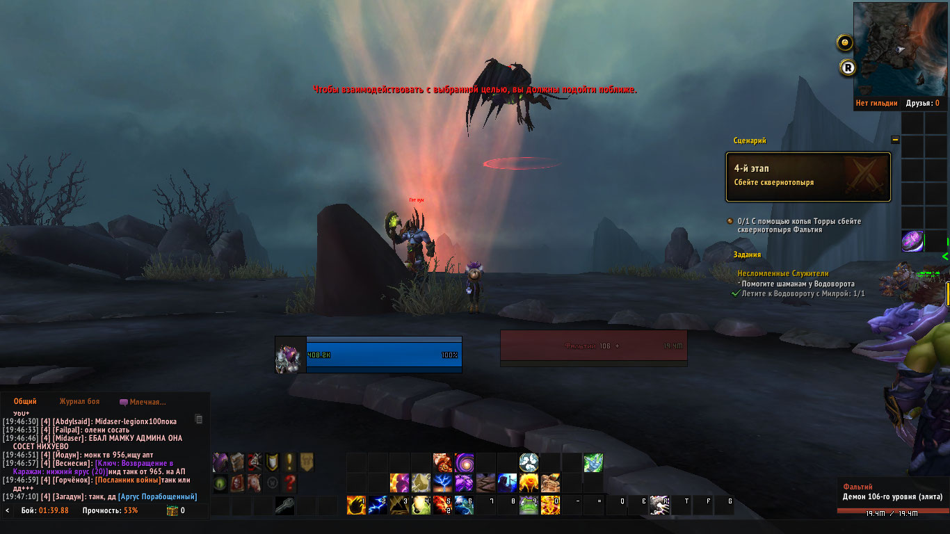 | Description | Если очень сильно повезет - то первый этап начнется. После десятка релогов/отмен квестов получается дойти до 4 этапа и после этого активный спелл для того, чтобы сбить сквернотопыря - не работает, а именно отсутствует. Релог, чистка кэша, исправление персонажа - НЕ ПОМОГАЮТ. Шаман свежий, сегодняшний. Видео дам ниже. | ||||