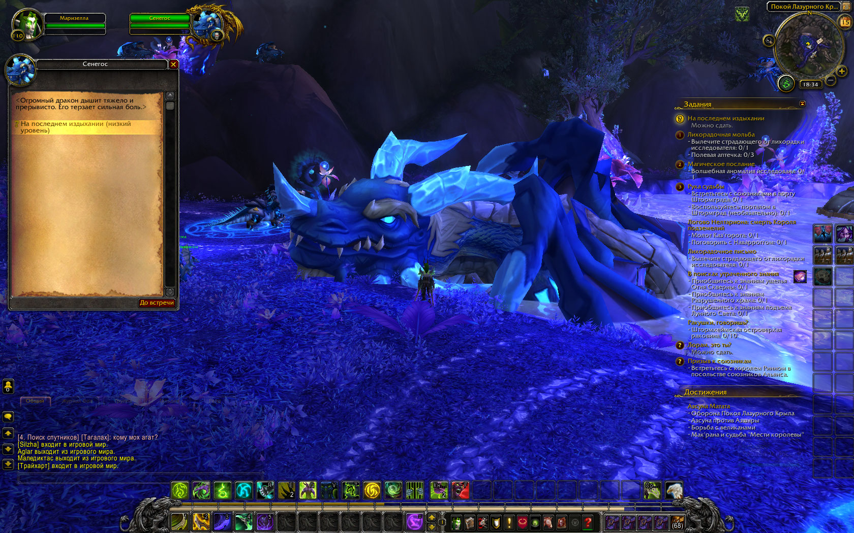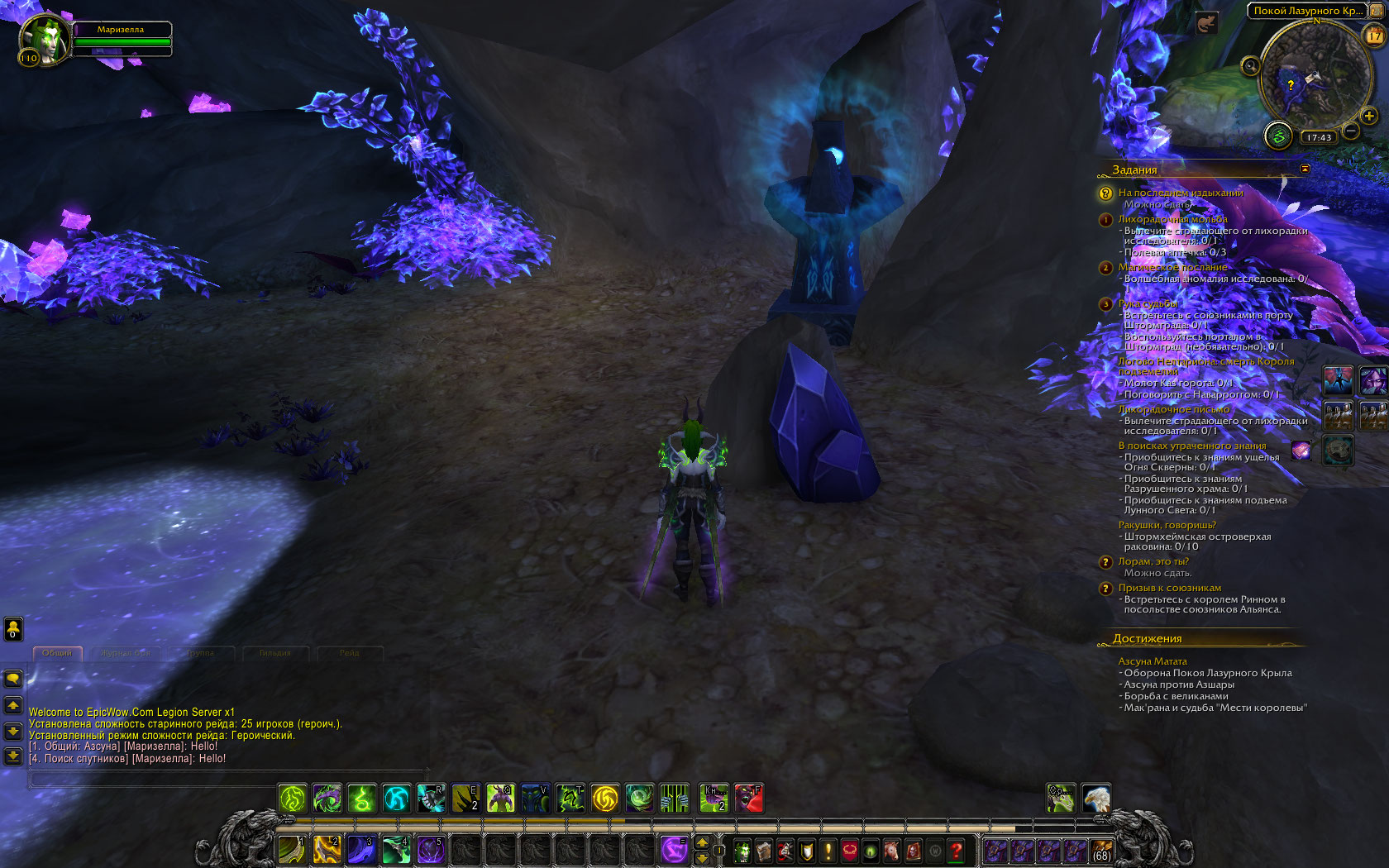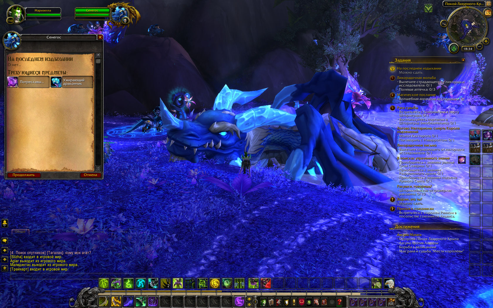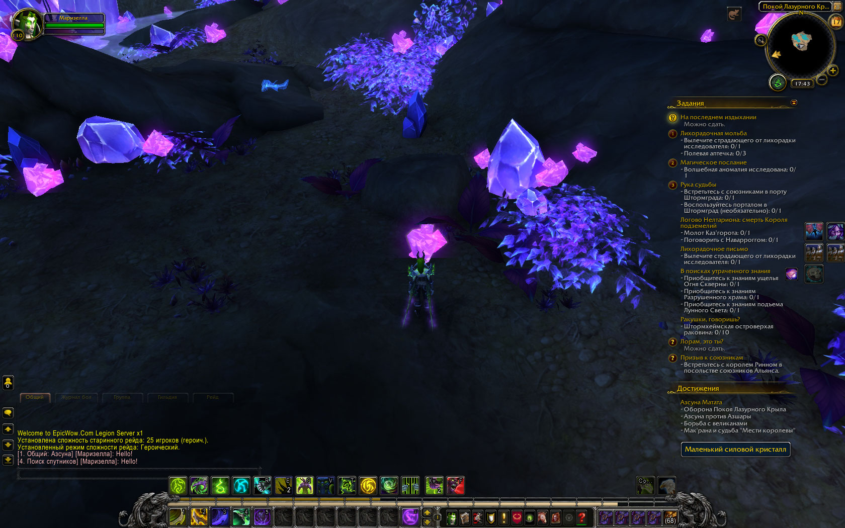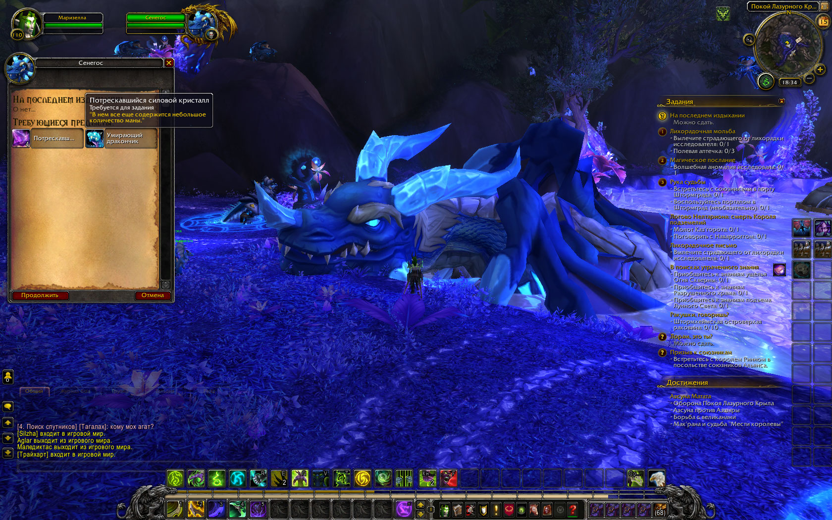 Здравствуйте! А можно ещё скрин пещеры? А-то у меня кристаллы собираются Есть вариант, что забагалось от того, что вы как-то скакнули цепочке вперёд, потому что квест на Лазурный покой появляется немного позднее квеста "В гущу боя" |
