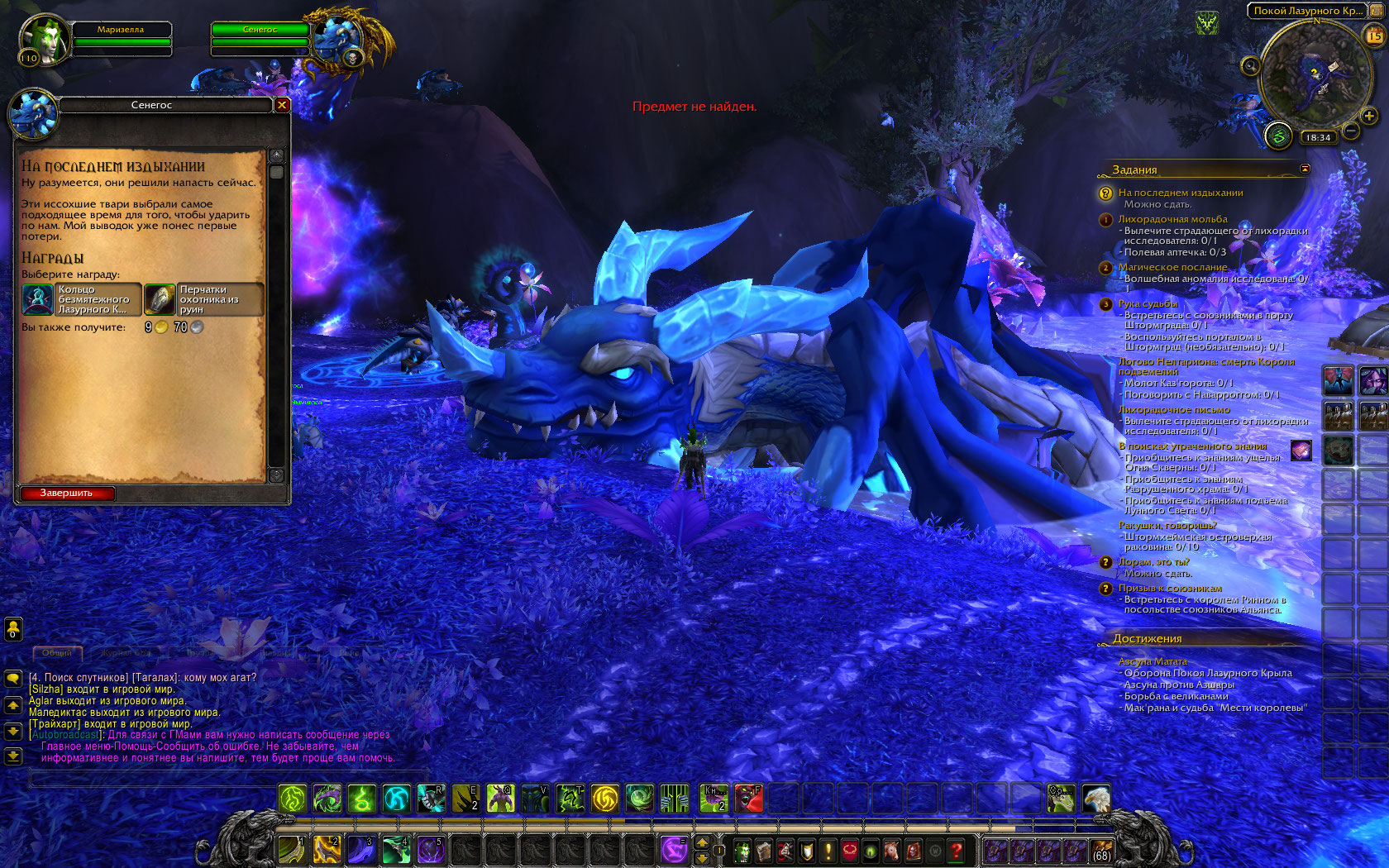 | Description | Для задания не существует предметов. В пещере позади Агапанта должны браться кристаллы (модель схожа с кристаллами древней манны), но они в ней неюзабельны. Дракончиков можно поднять и без них, но это не дает возможности сдать задание. При попытке сдать задание без кристаллов пишет "Предмет не найден" (Пример на скриншотах ниже). Так-же нет возможности даже начать цепочку заданий в Азсуне. (Тема "В гущу боя", задания не берутся). | ||||