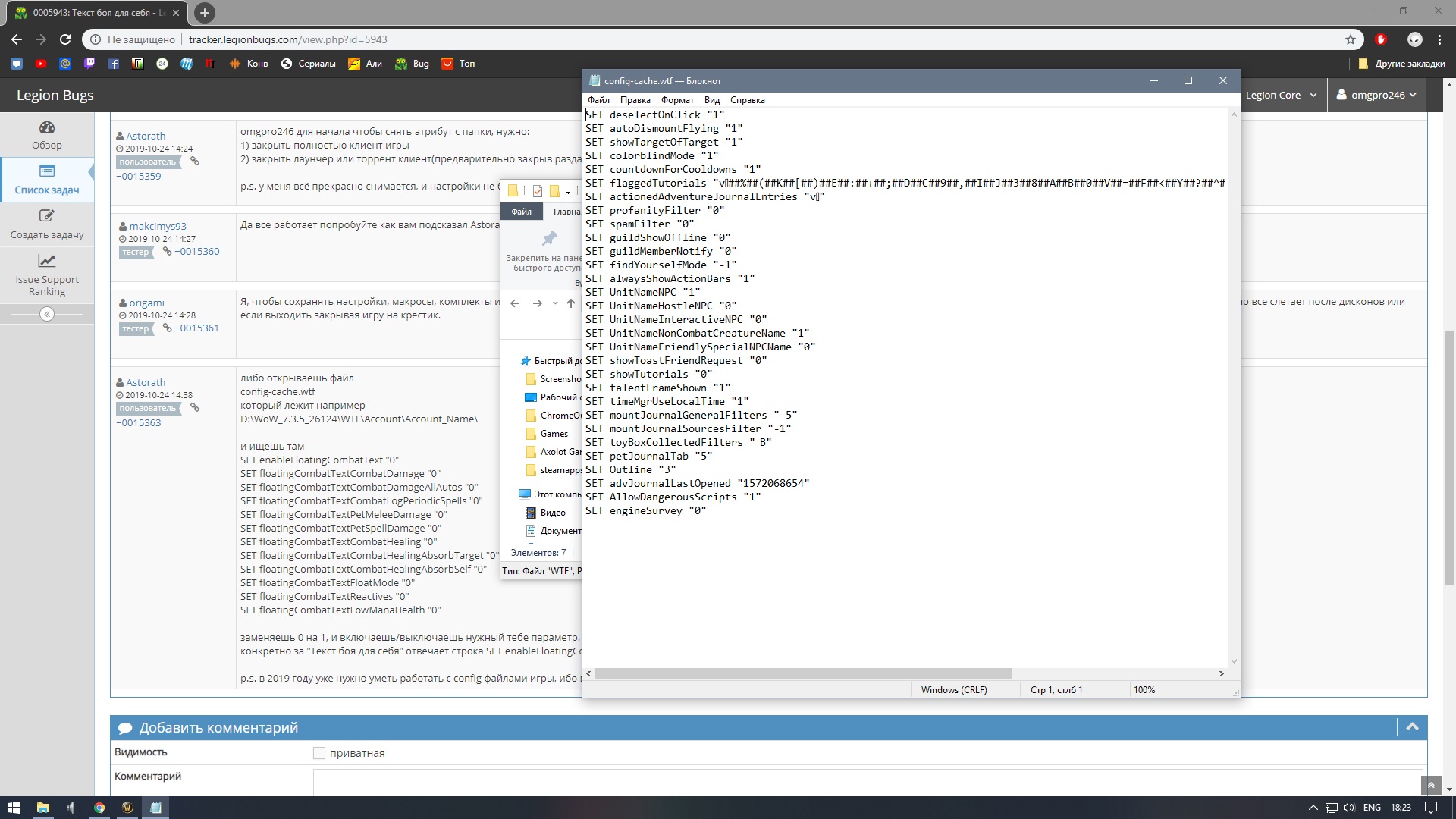 Окей, есть некий прогресс. На самом файле WTF галочка "только для чтения" убрана. Я снова вставил строки настройки комбат текста - и о чудо - после сохранения и проверки текст никуда не исчез. Я прослезился и побежал проверять в игру наличие заветной галочки, но увы она не горела. Снова зашел в WTF - строк нету. |