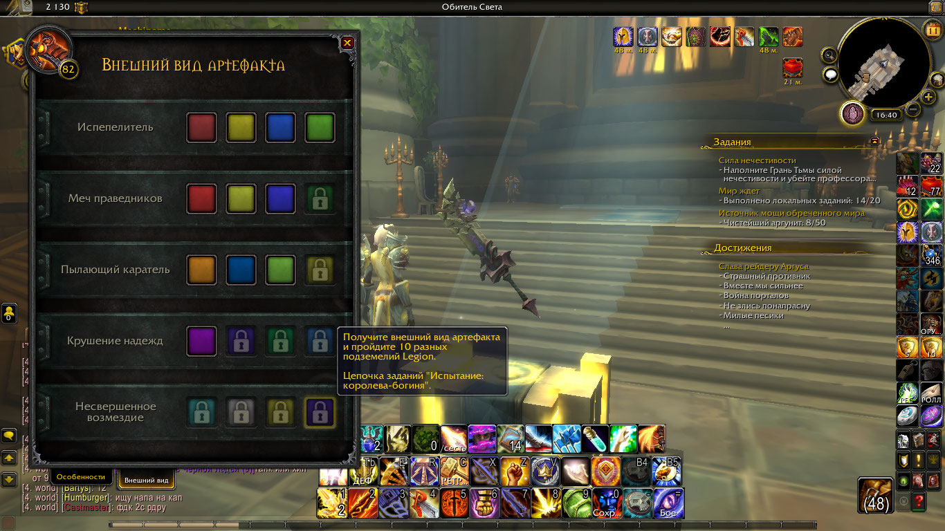и да, данное достижение Сражайся стильно: тайный вид, анлочит другой облик у паладина(скрытый 6ой облик). а на скрине http://tracker.legionbugs.com/file_download.php?file_id=4545&type=bug - ты показываешь 5ую строчку которая получается после прохождения испытаний башни магов. |