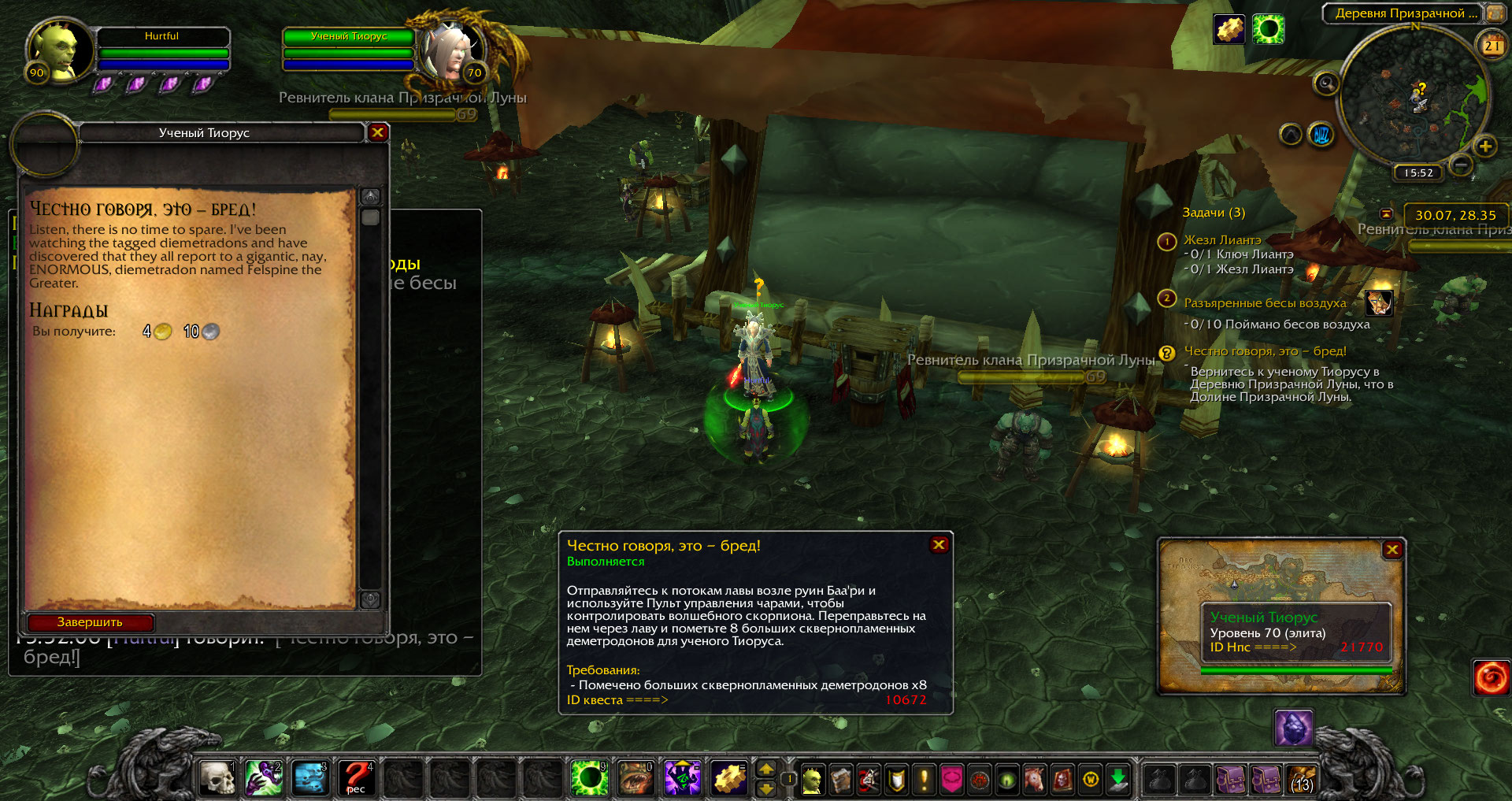 | Description | https://ru.wowhead.com/quest=10672 1) способность https://ru.wowhead.com/spell=37851 у https://ru.wowhead.com/npc=21909 можно использовать на любого нпс; 2) можно сделать весь квест на 1 мобе. Требуется стать подальше от моба и просто спамить https://ru.wowhead.com/spell=37851. Пока на моба не повесится баф от спелла, каждое нажатие будет засчитываться в счетчик; 3) при рассеивании/окончании https://ru.wowhead.com/spell=37868 https://ru.wowhead.com/npc=21909 нападает на игрока. Бить моба нельзя, он дружелюбен; 4) при сдаче квеста https://ru.wowhead.com/npc=21770 текст не переведен | ||||