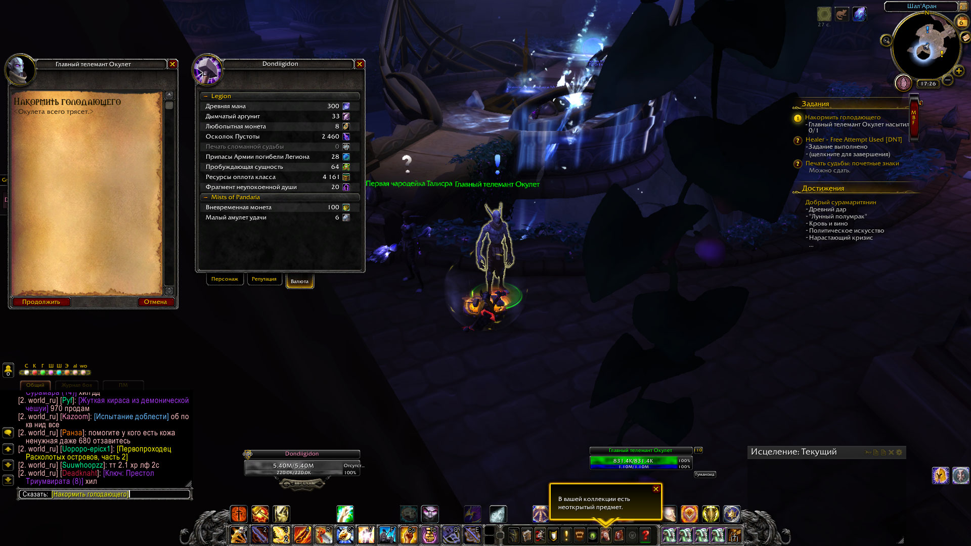 | Description | Здравствуйте,проблема такая,берешь кв [Накормить голодающего]https://ru.wowhead.com/quest=44691,и мы должны накормить его имя при себе 50+древней маны. У меня имеется 300 древнкей маны,но я не могу этого сделать... Как быть ? | ||||