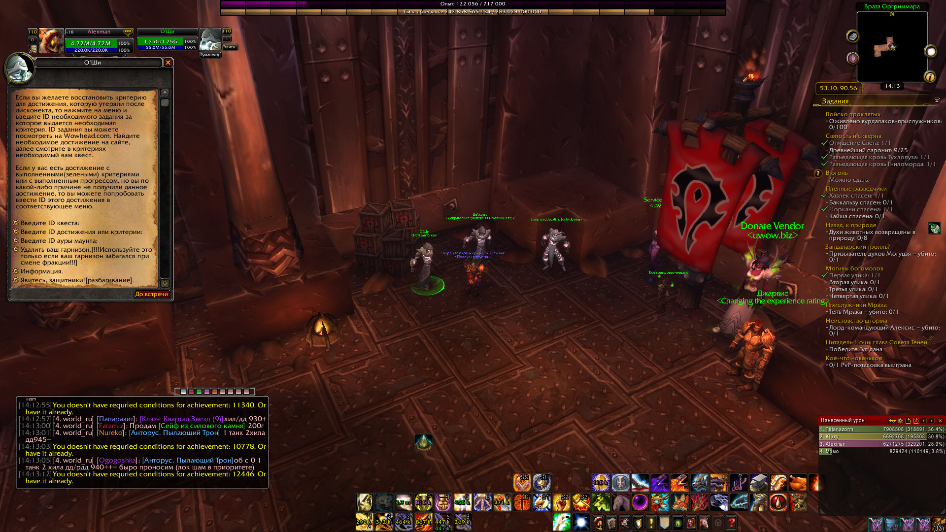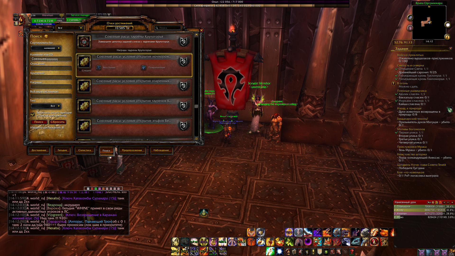 | Description | не могу создавать черных эльфов xD https://ru.wowhead.com/achievement=11340 есть https://ru.wowhead.com/achievement=10778 есть Достижения и репутация привязываются к учетной записи. Дальше вам необходимо посетить персонажем за Орду посольство в Оргриммаре, где вам придется выполнить несколько заданий и сценарий. После выполнения вы сможете создавать Ночнорожденных на вашем сервере. https://ru.wowhead.com/quest=49973 квеста нигде нет https://ru.wowhead.com/quest=49613 квеста нигде нет https://ru.wowhead.com/quest=49354 квеста нигде нет https://ru.wowhead.com/quest=49614 квеста нигде нет .q s 49930 + .q s 50242 + что не так ? | ||||