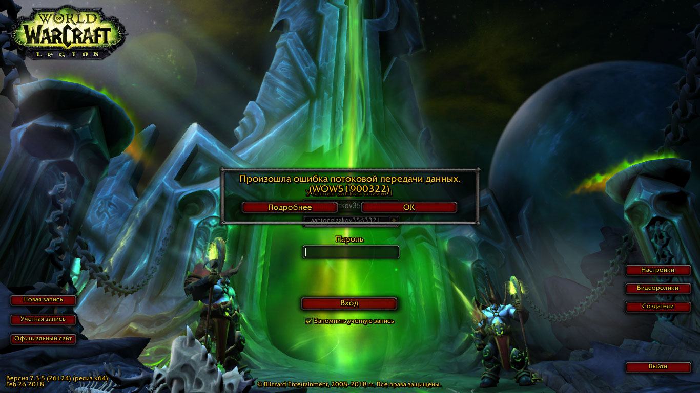 | Description | Здравствуйте. Каждый раз, как перемещаюсь в зону "Крутогорье", начинает дисконить и выходит wow51900322 ошибка. После этого когда пытаюсь зайти в игру, игра повисает в загрузочном окне. | ||||