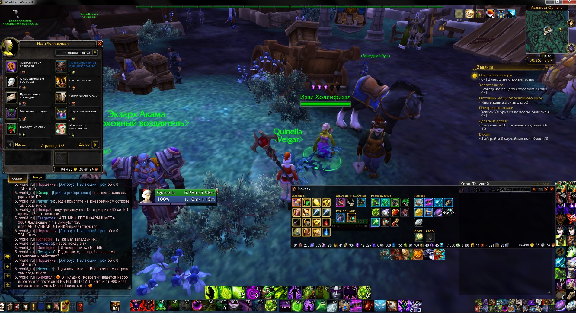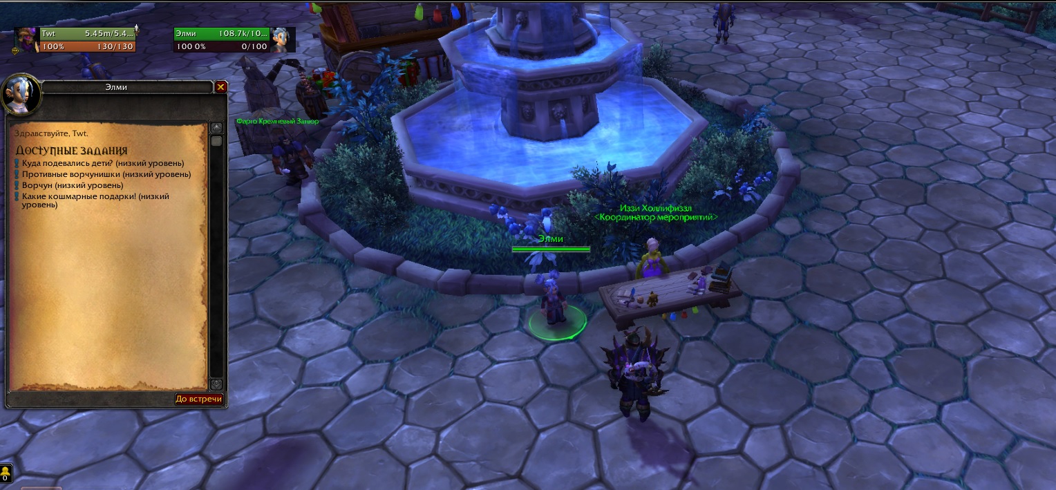 re2all, как и в данной теме http://tracker.legionbugs.com/view.php?id=7250, кв даёт https://ru.wowhead.com/npc=96362/иззи-холлифиззл#sells , только в гарнизоне Альянса. На данный момент npc стоит (смотреть скрин), но квестов не дает. В гарнизоне орды всё работает почти как надо, 2 нпс дают квесты, за которые получаешь валюту https://ru.wowhead.com/item=128659/веселые-припасы, и покупаешь у одного и npc предметы ивентов. Примечание: Данные NPC обычно должны появляться в гарнизоне 3-уровня, на данный момент прокачать гарнизон не возможно по техническим проблемам, а починка думаю закончиться не раньше конца зимнего ивента. Так что думаю лучше внести такое же решение как и на Орде, ну это уже Вам решать =) Оффтоп: А где можно посмотреть список скриптов разрешенных для использования игроками? - есть ли команда активирующий некий скрипт, который визуально игроку не виден? ( как пример: "Завершите строительство казарм: https://ru.wowhead.com/quest=34587/постройка-казарм" |