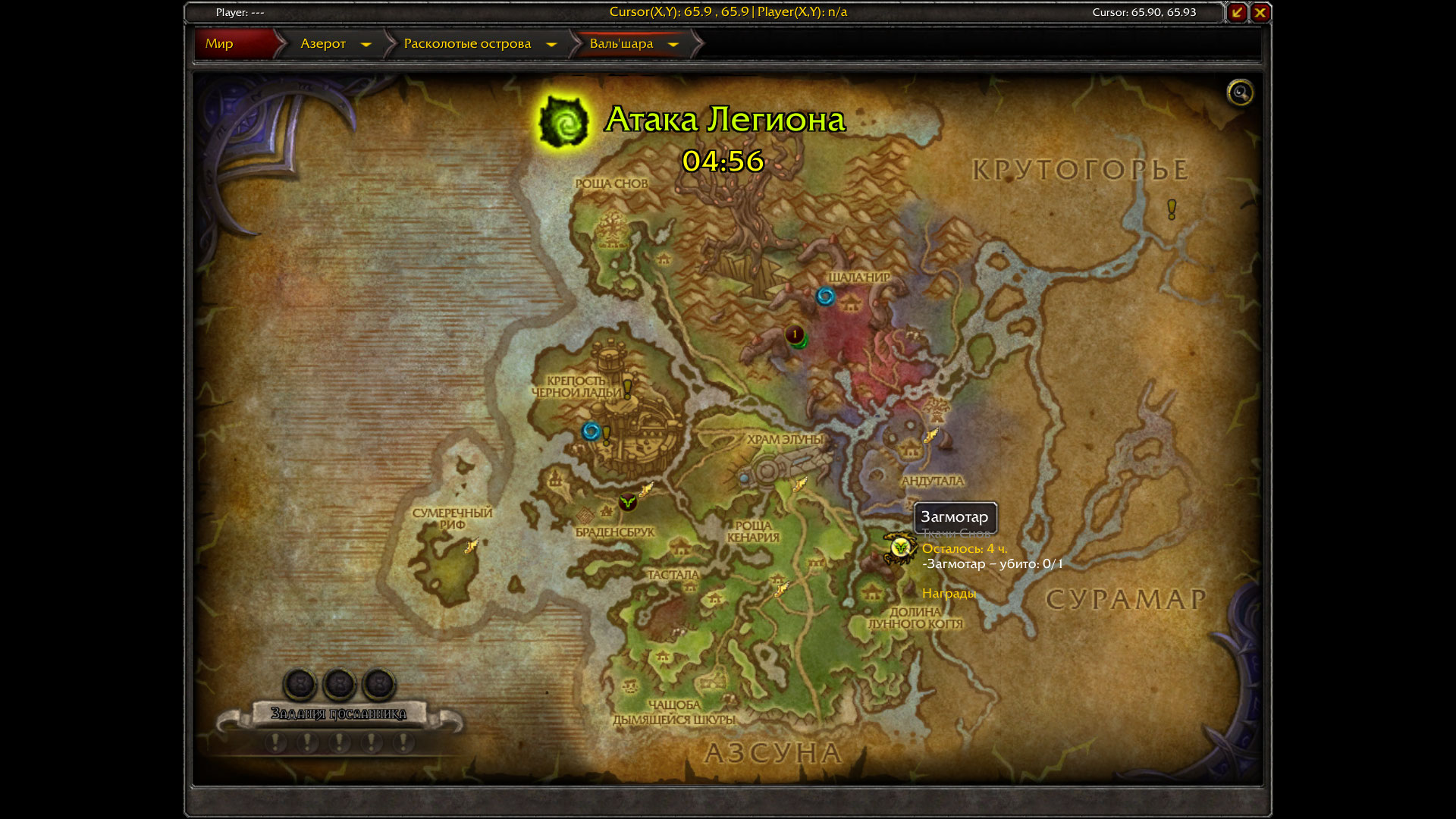 | Description | Данный квест https://ru.wowhead.com/quest=45927/ является локальным заданием Атаки Легиона в Вальшаре. Он просто не рабочий, даже сама область локалки не появляется и если навести курсор на локалку то он имеет отображение как на скрине. И это не "Не прогрузился клиент \ квест" - это оно ВСЕГДА так. | ||||