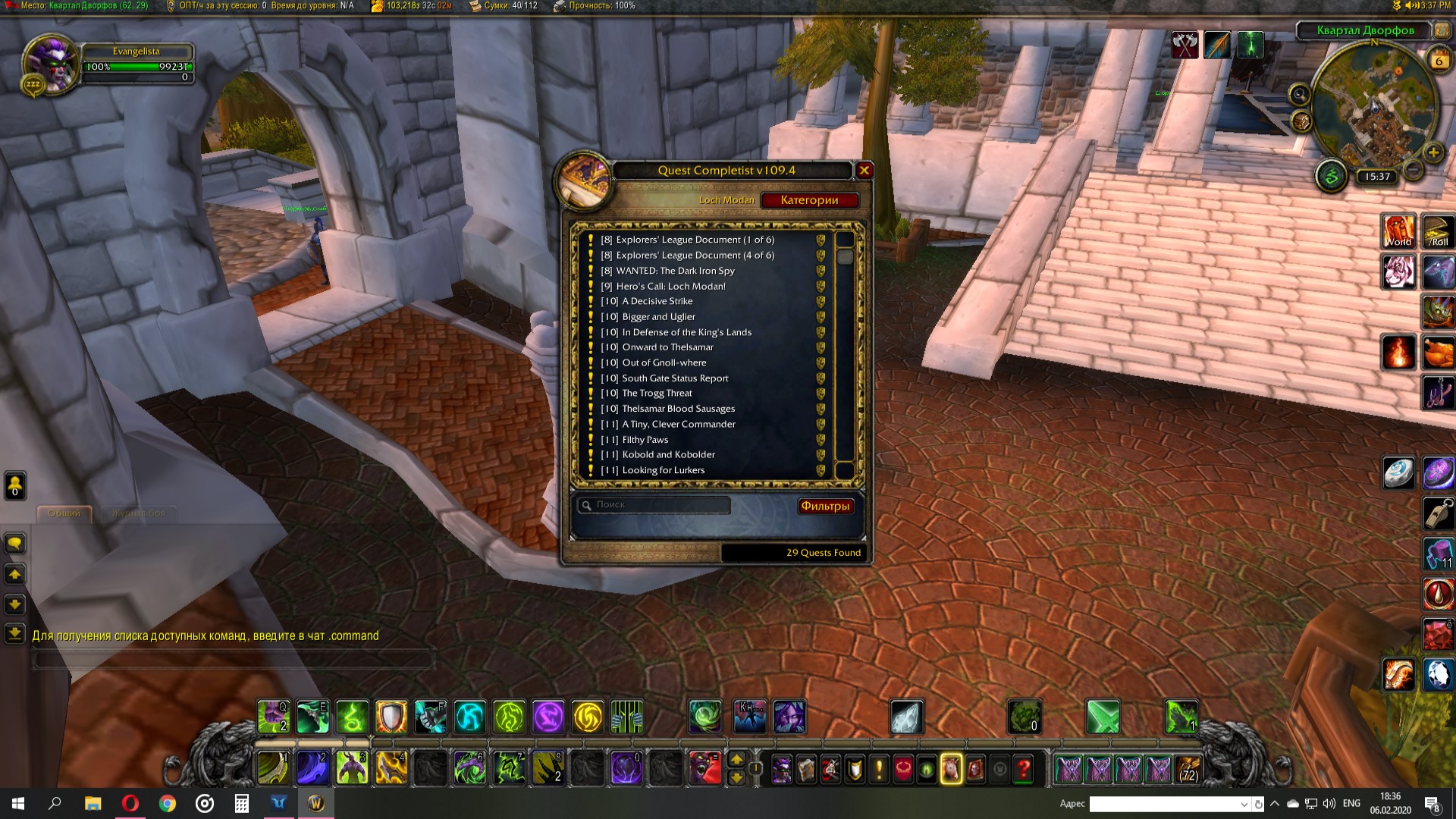 Я пролетелся по всем квестам в локации которые указаны на карте как невыполненые, квесты никто не дает. Так же сделал все квесты в Дун мороге, начиная со стартовой локации дворфов. Пролетел весть Стальгорн, там нет квестов в Лок Модан. Квест https://ru.wowhead.com/quest=28567 я делал, только брал у охранника в центре Стальгорна. Скрины квест гивера по паукам и карты Лок Модана в приложении. По карте видно, что даже внутри игровой квестхелпер не показывает не выполненных квестов. |