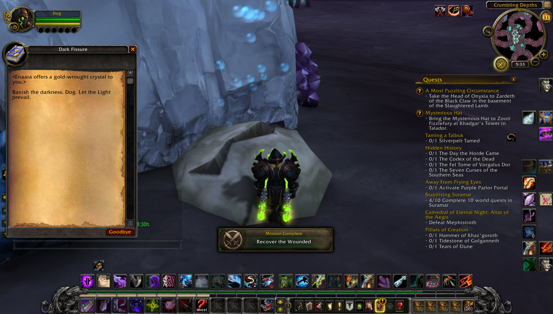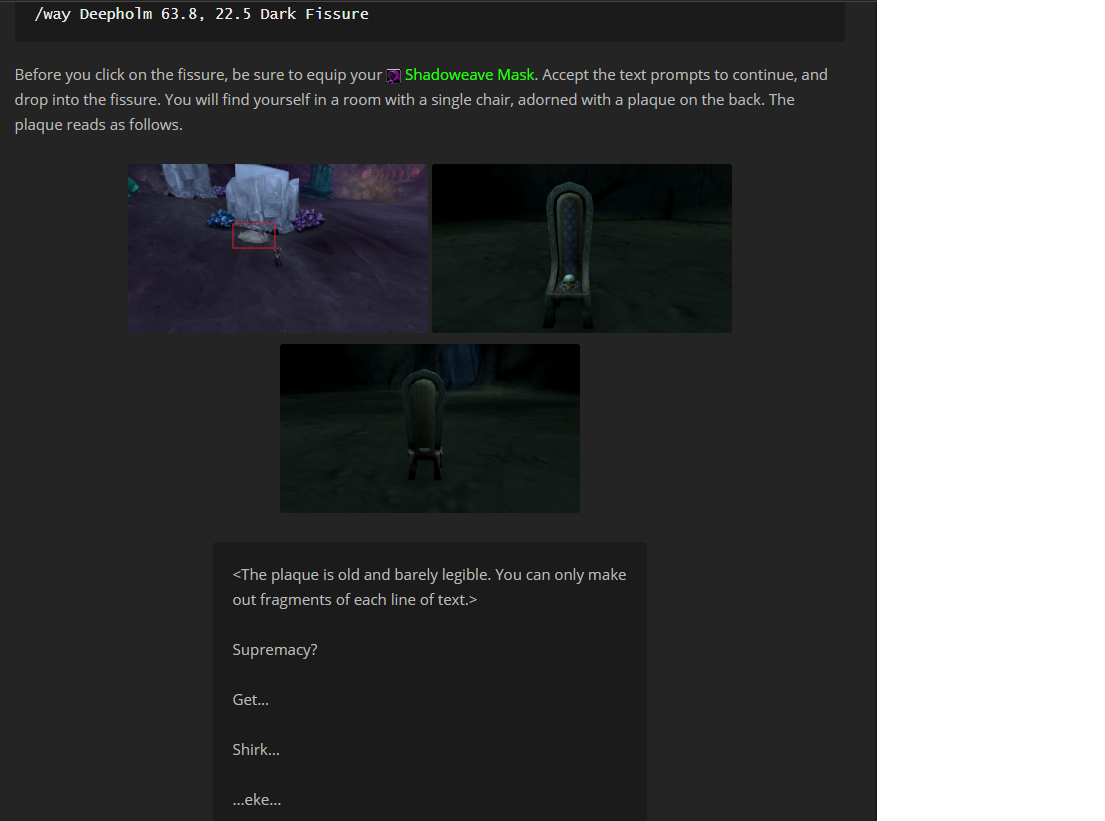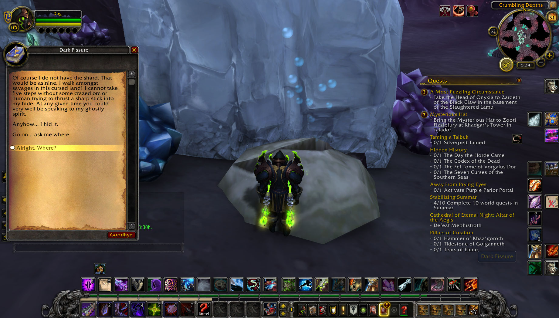 | Additional Information | The dark fissures dialogue should be as followed. <A fissure in the ground, barely wide enough to squeeze through. It's too dark to see anything, but you can tell that it is very deep.> with an option that says: <Drop into the fissure.> which proceeds to a warning "WARNING: You are about to fall into a dark fissure. You may not be able to climb back out again. Are you very sure you want to do this? https://wow.gamepedia.com/Dark_Fissure Here is a full list as well of the whole puzzle but I'll drop the screenshots of what it should be as well. https://www.wowhead.com/guides/lucid-nightmare-secret-mount Thanks for taking the time for this and have a great day, stay safe as well. | ||||