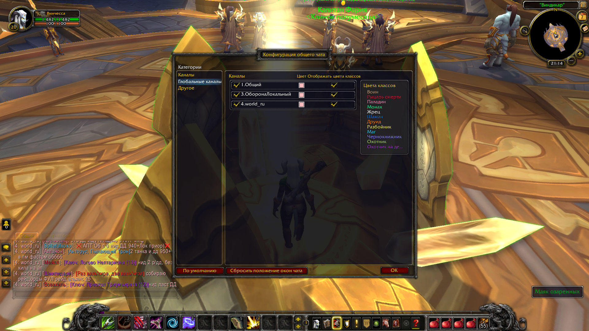 Допилю немного напильником ответ тестера :) 4. world.ru - это Ваше творчество, Вы можете создать канал чата и назвать его как угодно. Сложно будет остальным игрокам присоединиться к этому каналу. Раньше был один общий чат "ПоискСпутников". На сервере имеются два стандартных канала общего фракционного чата World_ru общий канал для русскоговорящего населения World_en соответственно для англов и прочих немцев с датчанами. Жаль китайцы не переехали туда :) Для того чтобы покинуть канал нужно ввести в чате команду /leave world.ru - имя канала для примера в Вашем случае Для присоединения к каналу следует ввести команду /join world_ru - имя канала должно соответствовать Вашему выбору, чтобы увидеть сообщения других игроков они должны присоединиться к каналу. И проводить операции лучше всего в столице фракции. Просто пересобрать каналы чата и релогнуться. зы. на оффе еще есть такая хитрая команда как /resetchat , но я не уверен что на наших серверах она работает |