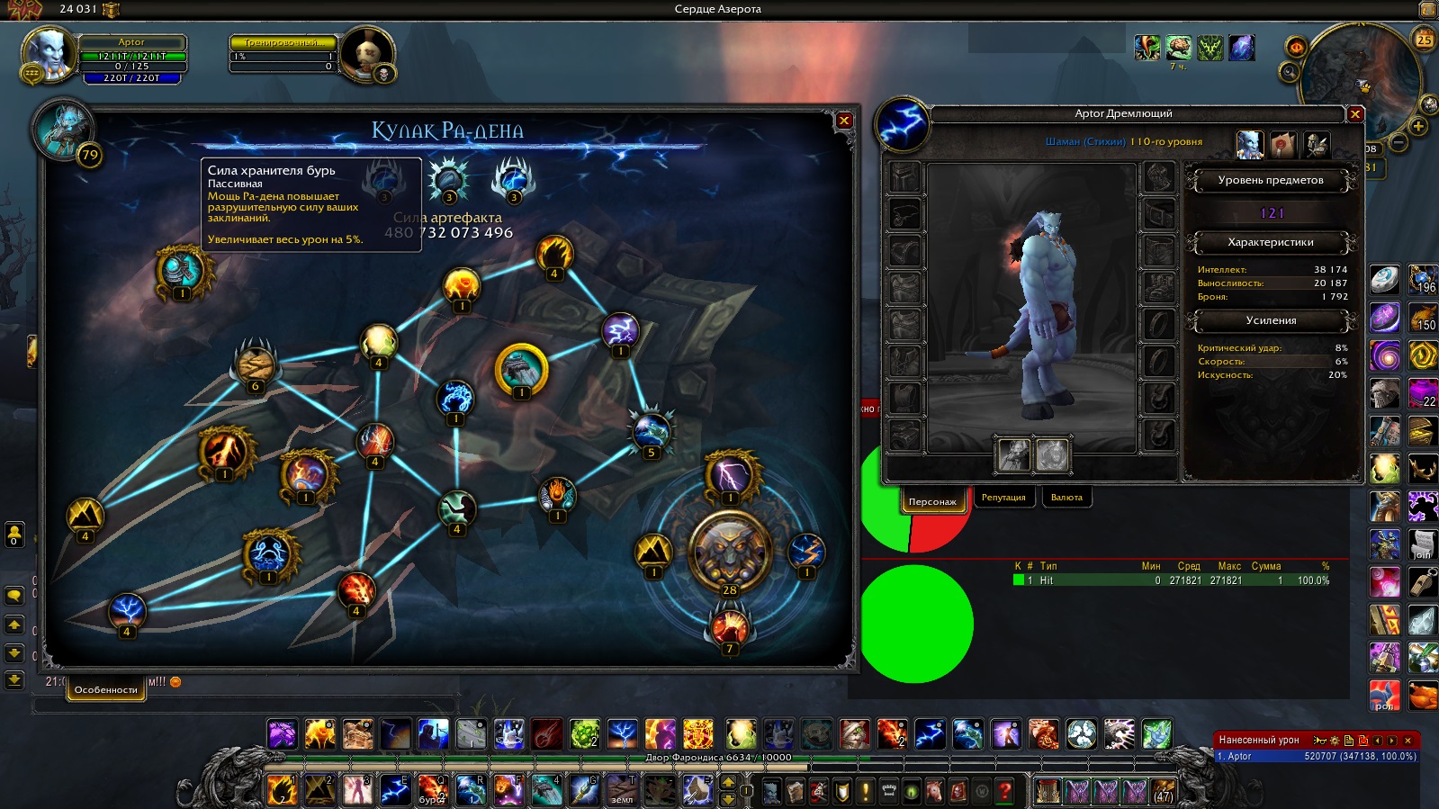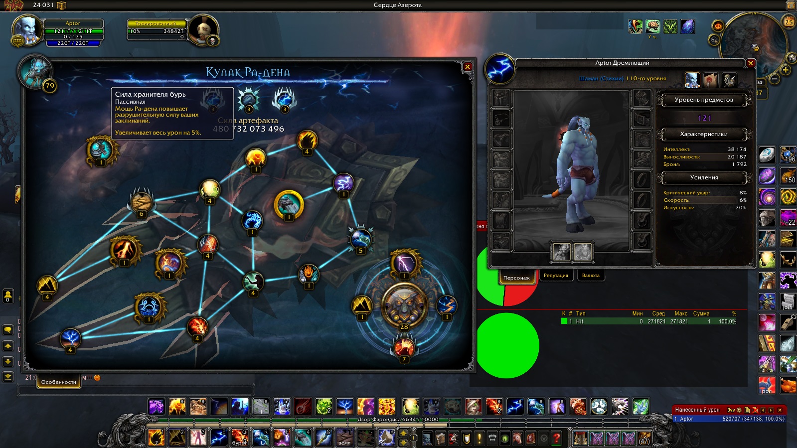 Атенсьен!! Все расчеты представленные тут приблизительные и не рассчитывают на достоверность =) Выброс лавы В спеке стихии урон - 24 401 (Screenshot_12) В спеке исцеление урон - 31 900 (Screenshot_13) Разница между числами урона - 23,51% 100 - ( 33 836 / 44 236 * 100 ) Допустим хилов подкрутили слегка, чтобы дамаг хоть какой-то выдавали. Коэффициент силы заклинания(СЗ) * 1 int = СЗ. Больше коэффициент у хила Разберем артефактное оружие по выбросу лавы для обоих специализаций, что влияет 1. Интеллект Голый персонаж ХИЛ 8 140 инт 31 900 СЗ ЭЛЕМ 8 140 инт 24 401 СЗ Коэффициент СЗ для хила 31 900 / 8 140 ≈ 3,91 Коэффициент СЗ для элема 24 401 / 8 140 ≈ 2,99 Голый + Дробяшка и щит с оплота ХИЛ 11 288 инт 44 236 СЗ ЭЛЕМ 11 288 инт 33 837 СЗ Коэффициент СЗ для хила 44 236 / 11 288 ≈ 3,91 Коэффициент СЗ для элема 33 837 / 11 288 ≈ 2,99 Голый + Артефактное оружие - на силу заклинания будут(должны) влиять характеристики артефактного оружия ХИЛ 37 624 инт 147 440 СЗ ЭЛЕМ 38 174 инт 128 159 СЗ Для проверки - будут ли вложенные характеристики в артефактное оружие менять коэффициент СЗ (понимаю что не должно, он статичен, и в данном расчете опускаем что есть пассивные способности артефакта, которые меняют в % силу заклинания) Коэффициент СЗ для хила 37 624 / 147 440 ≈ 3,91 (странно, у артефакта шамана исцеление +10% урона должна быть прибавка к силе заклинания самого заклинания, коэффициент не изменился) больше похоже что Эхо служителей земли https://ru.wowhead.com/spell=241205/%D1%8D%D1%85%D0%BE-%D1%81%D0%BB%D1%83%D0%B6%D0%B8%D1%82%D0%B5%D0%BB%D0%B5%D0%B9-%D0%B7%D0%B5%D0%BC%D0%BB%D0%B8 не работает или сам специализация дает эту пассивную способность без надетого артефактного оружия(что сомнительно) Коэффициент СЗ для элема 33 837 / 11 288 ≈ 3,35 (тут поменялся, то есть сам артефакт влияет на прибавку силы заклинания выброса лавы за счет пассивных способностей артефакта ) гораздо сложнее проверять х) 2. Судя по проверке коэффициента СЗ с артефактным оружием проверим все пассивные взяв за базовый коэффициент СЗ за 3.91 ХИЛ и 2.99 ЭЛЕМ что дает 1 единица интеллекта Выброс лавы ХИЛ 37624(int)*3.91(коэффициент СЗ)+10%https://ru.wowhead.com/spell=241205/%D1%8D%D1%85%D0%BE-%D1%81%D0%BB%D1%83%D0%B6%D0%B8%D1%82%D0%B5%D0%BB%D0%B5%D0%B9-%D0%B7%D0%B5%D0%BC%D0%BB%D0%B8 = 147109,84+14710,98 = 161820,82 Выброс лавы ЭЛЕМ (38 174(int)*2.99(коэффициент СЗ без влияния пассивок артефактного оружия)) + 10% https://ru.wowhead.com/spell=241202/%D1%81%D0%B8%D0%BB%D0%B0-%D1%81%D0%BB%D1%83%D0%B6%D0%B8%D1%82%D0%B5%D0%BB%D0%B5%D0%B9-%D0%B7%D0%B5%D0%BC%D0%BB%D0%B8 + 5% https://ru.wowhead.com/spell=241202/%D1%81%D0%B8%D0%BB%D0%B0-%D1%81%D0%BB%D1%83%D0%B6%D0%B8%D1%82%D0%B5%D0%BB%D0%B5%D0%B9-%D0%B7%D0%B5%D0%BC%D0%BB%D0%B8 + 12% https://ru.wowhead.com/spell=191504/%D0%BF%D0%B5%D1%87%D0%B0%D1%82%D1%8C-%D0%BB%D0%B0%D0%B2%D1%8B = 114 140 +11 414+ 5 707 + 13697 = 144958, у моего элема вышло 128 159 в клиенте. ИЗ приведенных показателей больше похоже что https://ru.wowhead.com/spell=191504/%D0%BF%D0%B5%D1%87%D0%B0%D1%82%D1%8C-%D0%BB%D0%B0%D0%B2%D1%8B работает остальное нет х) |