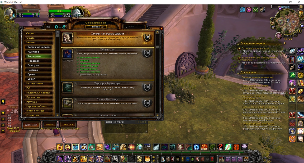 | Description | https://ru.wowhead.com/achievement=1190/ Не засчитывается критерий "Путешествие со спорлингами" https://ru.wowhead.com/quest=9726/ Квест выполнен, перезачёт не даёт критерий. Слева в чате на скриншоте видно, что квест 9726 выполнен и перезачёт у О"ши. | ||||